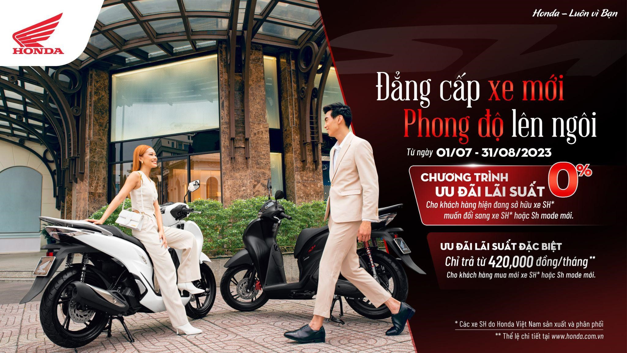 Chương trình diễn ra trong vòng hai tháng, từ 01/07 - 31/08/2023 (căn cứ theo ngày ghi trên Hóa đơn GTGT xuất cho khách hàng mua xe), áp dụng với khách hàng mua các dòng xe: SH160i, SH150i, SH125i, Sh mode với chương trình khuyến mại trả góp lãi suất 0% hoặc lãi suất thấp chỉ trả từ 420.000 đồng/tháng.