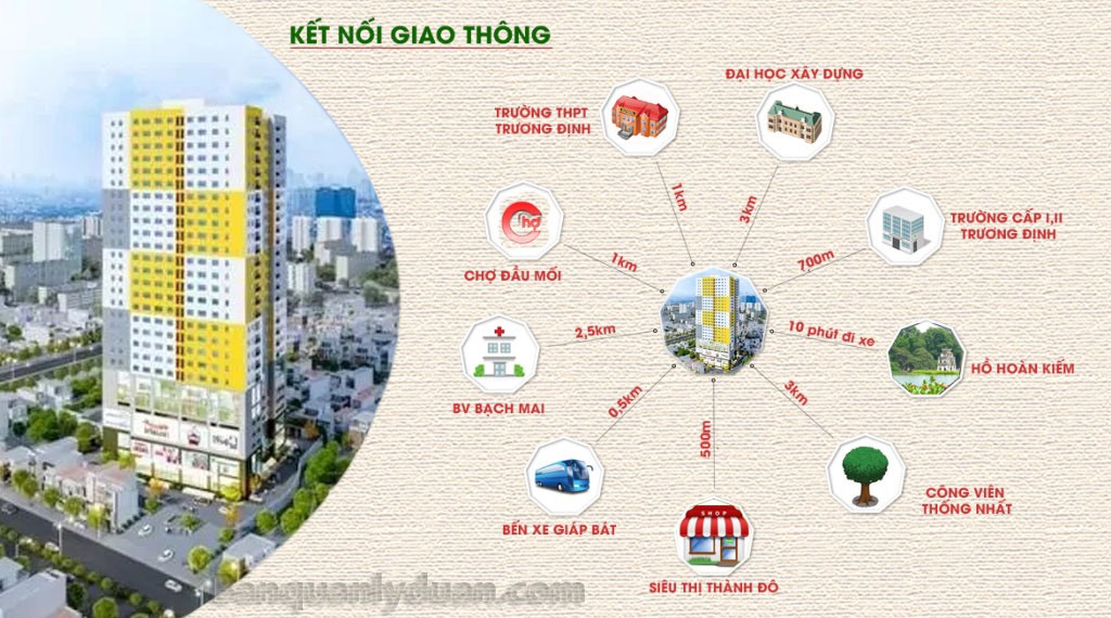 Từ dự án, các cư dân tại đây có thể thuận tiện di chuyển tới các quận trung tâm của thành phố bằng nhiều tuyến đường chính như: Trương Định, Minh Khai, Giải Phóng, Trường Chinh, Định Công…