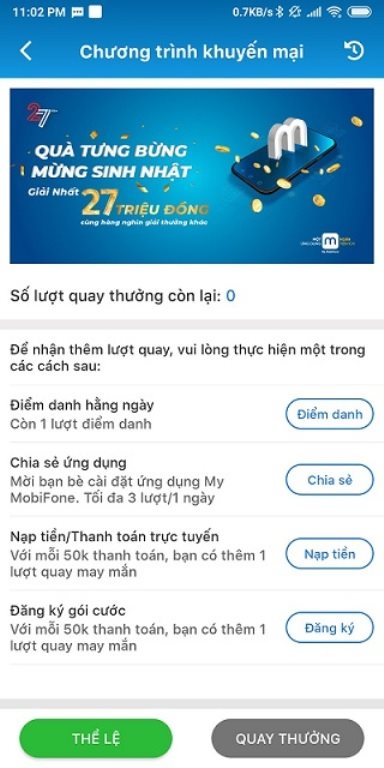 Cách 1: Khách hàng truy cập ứng dụng My MobiFone, click vào banner chương trình và đăng ký điểm danh (tối đa 01 lượt/thuê bao/ngày). Tương ứng với mỗi lần điểm danh thành công, thuê bao được nhận được 01 lượt quay thưởng trên ứng dụng My MobiFone.