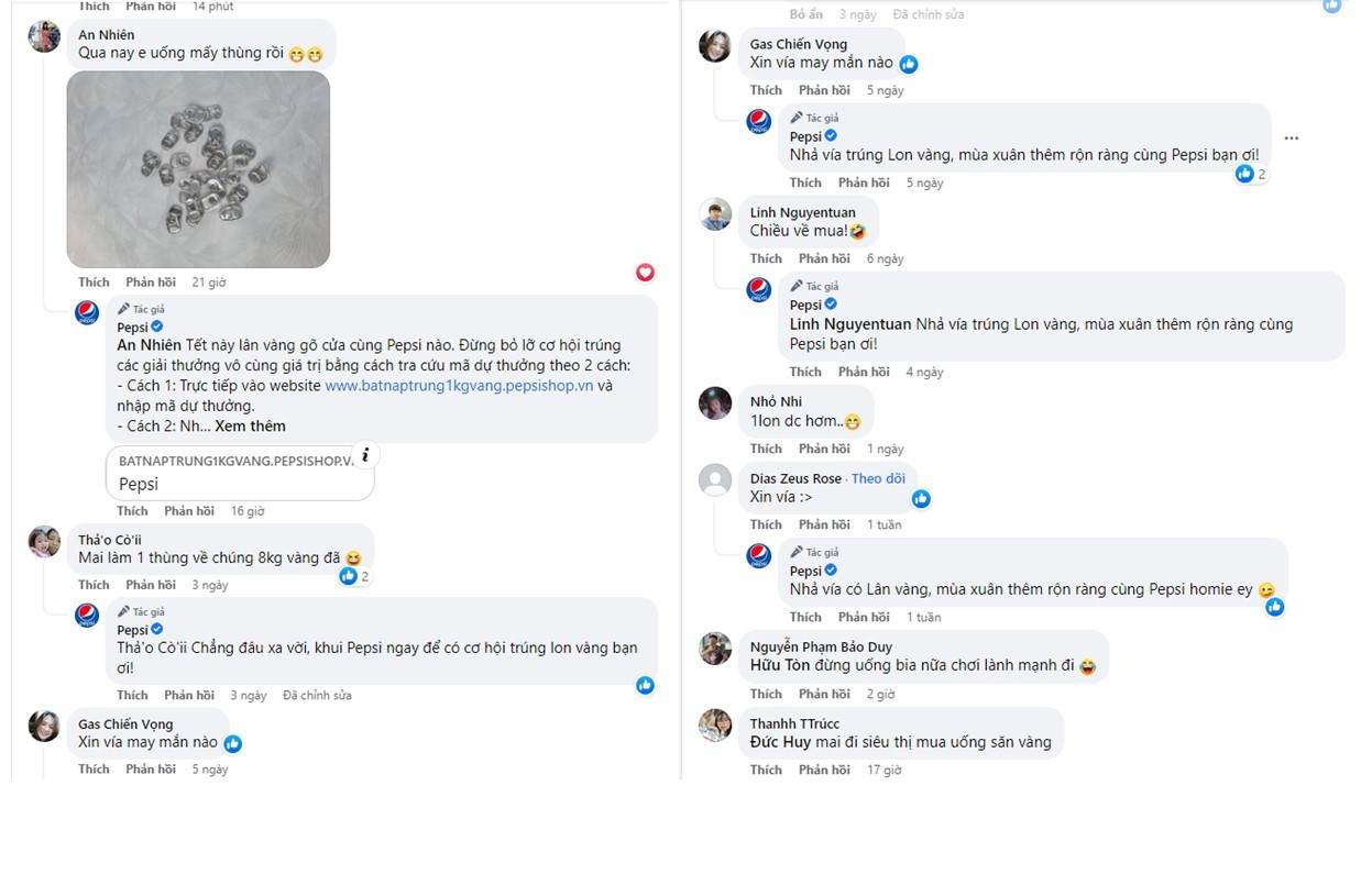 Những lon nước ngọt Pepsi, 7UP, Mirinda từ lâu đã trở thành một phần quen thuộc trong các bữa tiệc xuân, gắn bó với giây phút quây quần đón năm mới của hàng triệu gia đình Việt. Theo đại diện thương hiệu, những món quà trong chương trình “Bật nắp trúng 1kg vàng” lần này như lời chúc một năm mới an khang thịnh vượng, đồng thời là lời cám ơn dành cho khách hàng đã luôn yêu mến, ủng hộ và đồng hành cùng các thương hiệu trong suốt năm vừa qua.