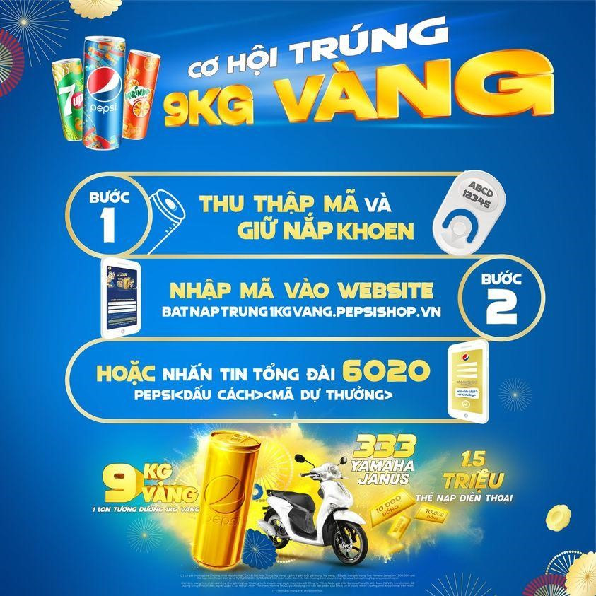 Cụ thể, khi mua bộ ba sản phẩm Pepsi, 7Up và Mirinda Tết này, khách hàng sẽ có cơ hội trúng nhiều giải thưởng hấp dẫn: 9 lon Pepsi hoặc Mirinda bằng vàng PNJ 9999 trọng lượng mỗi lon tương đương 1kg, 333 xe máy Yamaha Janus phiên bản 2022 sành điệu và hàng triệu thẻ nạp điện thoại Viettel, Mobifone, Vinaphone, Vietnam Mobile trị giá 10.000 VNĐ.