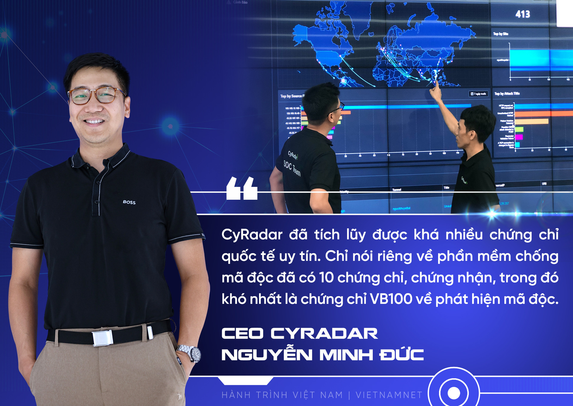 “Việc đạt các chứng chỉ quốc tế uy tín còn giúp chúng tôi được chia sẻ nguồn tài nguyên với những hãng lớn trên thế giới. Khi xuất hiện cuộc tấn công tại một quốc gia nào đó, có thể mình chưa hoạt động tại thị trường đấy, nhưng vì các hãng kia đã “bắt” được rồi chia sẻ thông tin, dữ liệu, nên mình cũng ghi nhận được luôn. Hiện CyRadar là hãng bảo mật có nguồn dữ liệu rất phong phú, thậm chí có thể nói là thuộc nhóm phong phú nhất trong các hãng bảo mật tại Việt Nam”, CEO CyRadar không giấu vẻ tự hào.