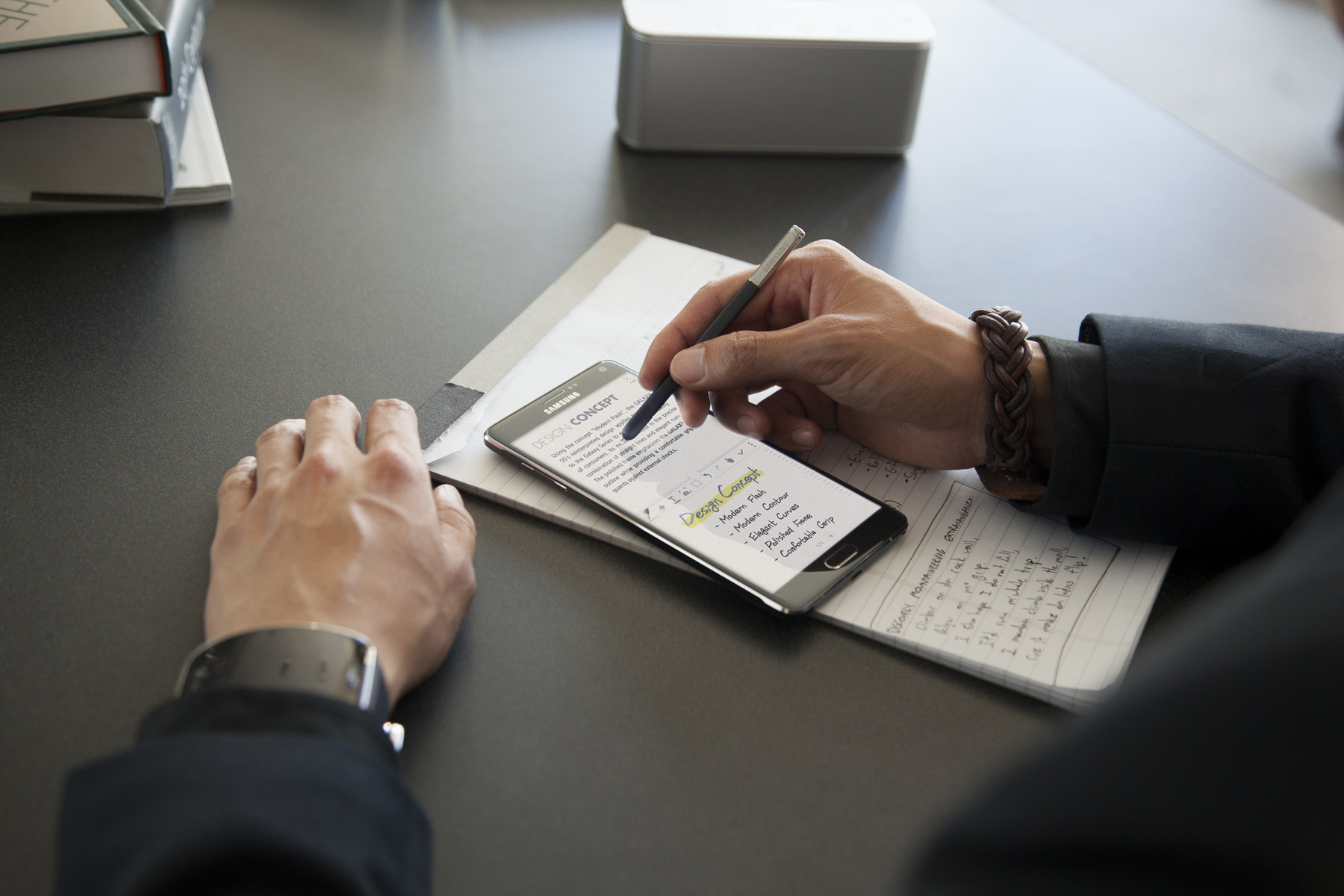 Note 4 được giới thiệu cùng giao diện mới để phù hợp hơn với bút cảm ứng S Pen có độ nhạy gấp 2 lần phiên bản trước. Bút S Pen từ nay có thể hoạt động tương tự con chuột máy tính, ví dụ, khi vào mục thư viện ảnh của Note 4, bạn chọn nhiều ảnh bằng cách click và kéo. Samsung còn nâng cấp ứng dụng S-Note để chụp ảnh với máy ảnh rồi chỉnh sửa sau đó.