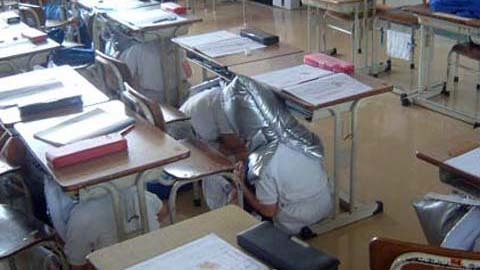 | Trẻ em Nhật Bản trong giờ học kỹ năng khi có hiệu lệnh xảy ra động đất. Ảnh do phụ huynh người Nhật gốc Việt cung cấp. |