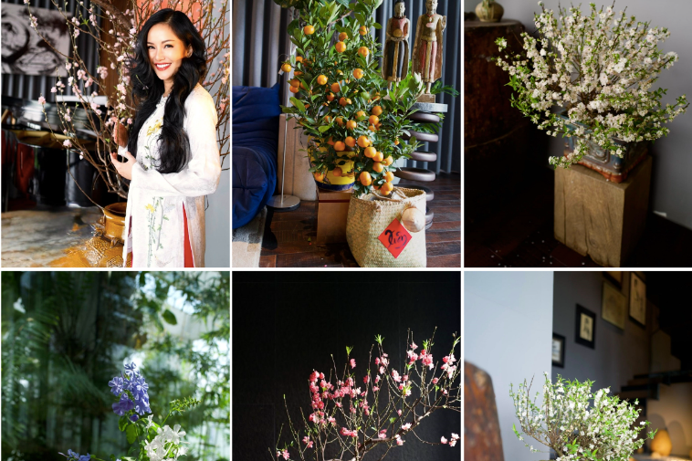 Hoa hậu Đỗ Thị Hà chọn cách đón Tết giản dị mà tinh tế khi tự tay cắm những bình hoa thược dược đa sắc và cành đào hồng rực trong căn bếp hiện đại.