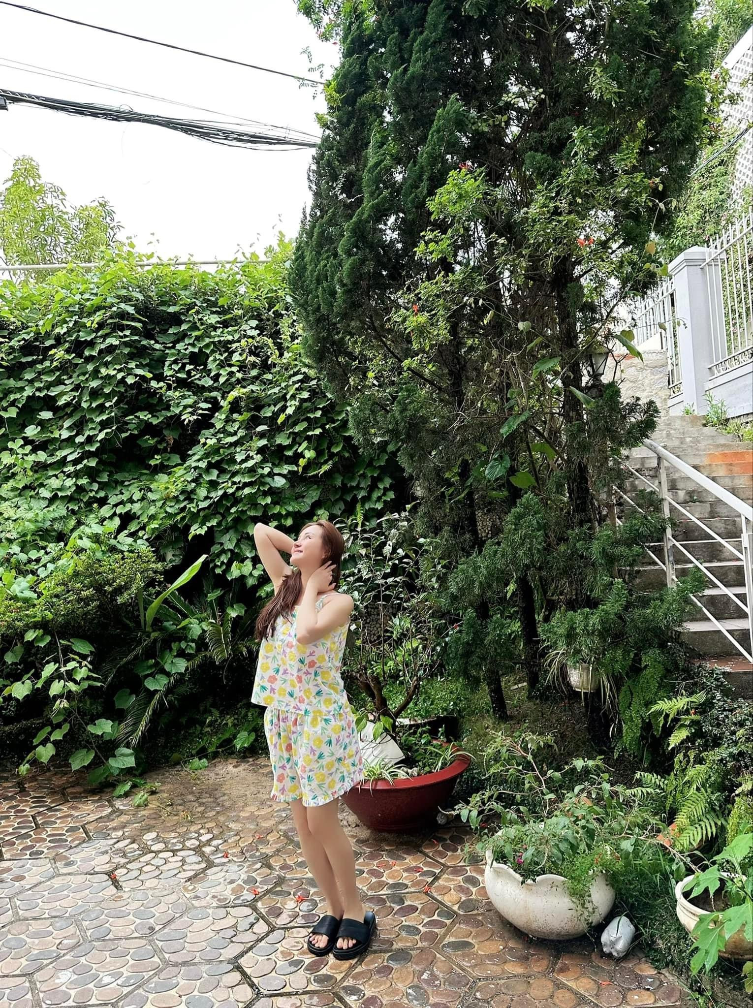 Về Đà Lạt, Vy Oanh không trang điểm mà giản dị khác hẳn hình ảnh váy áo chỉn chu, lộng lẫy trên sân khấu. Cô yêu thiên nhiên, thường dậy sớm để hít thở không khí trong lành mỗi sáng.