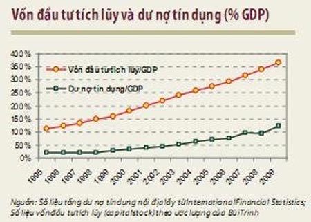 Về mặt số lượng, tổng vốn đầu tư tích lũy đã tăng từ mức 110% GDP trong năm 1995 lên trên 360% GDP trong năm 2009 (xem đồ thị). Về mặt chất lượng, ICOR của nền kinh tế tính theo vốn đầu tư đã tăng từ mức dưới 4,0 trong giai đoạn 1995-2000 lên 4,9 trong giai đoạn 2001-2005 và lên đến 6,8 trong giai đoạn 2006-2010.