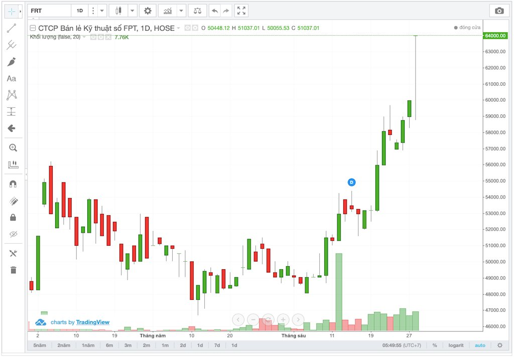Cách đây gần một tháng, FRT vẫn đang ở mức đáy, khoảng 49.000 đồng, tuy nhiên mã này tăng trưởng đột ngột qua từng ngày, và đạt mức 64.000 đồng như hiện nay, tăng khoảng 23%.
