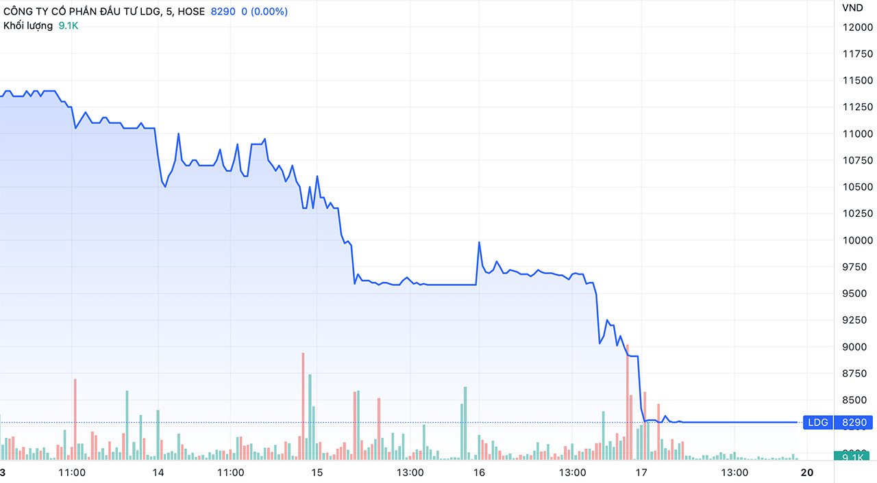 Từ 13/6 đến 17/6 và tính rộng hơn từ 7/1 đến 17/6, cổ phiếu LDG (Công ty cổ phần Đầu tư LDG) giảm gần 70% từ 27.300 đồng về 8.290 đồng/cổ phiếu.