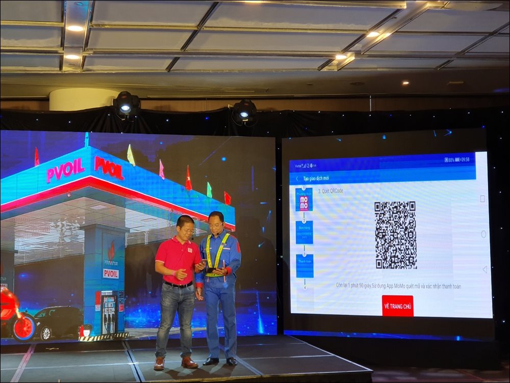 Ông Phạm Thành Đức (trái) - Tổng giám đốc Ví điện tử MoMo - và ông Cao Hoài Duơng - Tổng Giám đốc PVOIL đang minh hoạ thanh toán bằng MoMo tại cây xăng. |