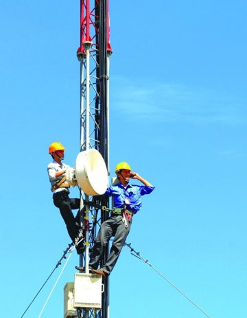 | Các kĩ sư Viettel làm công tác duy tu bảo dưỡng trên cột thu phát sóng di động vùng biển |