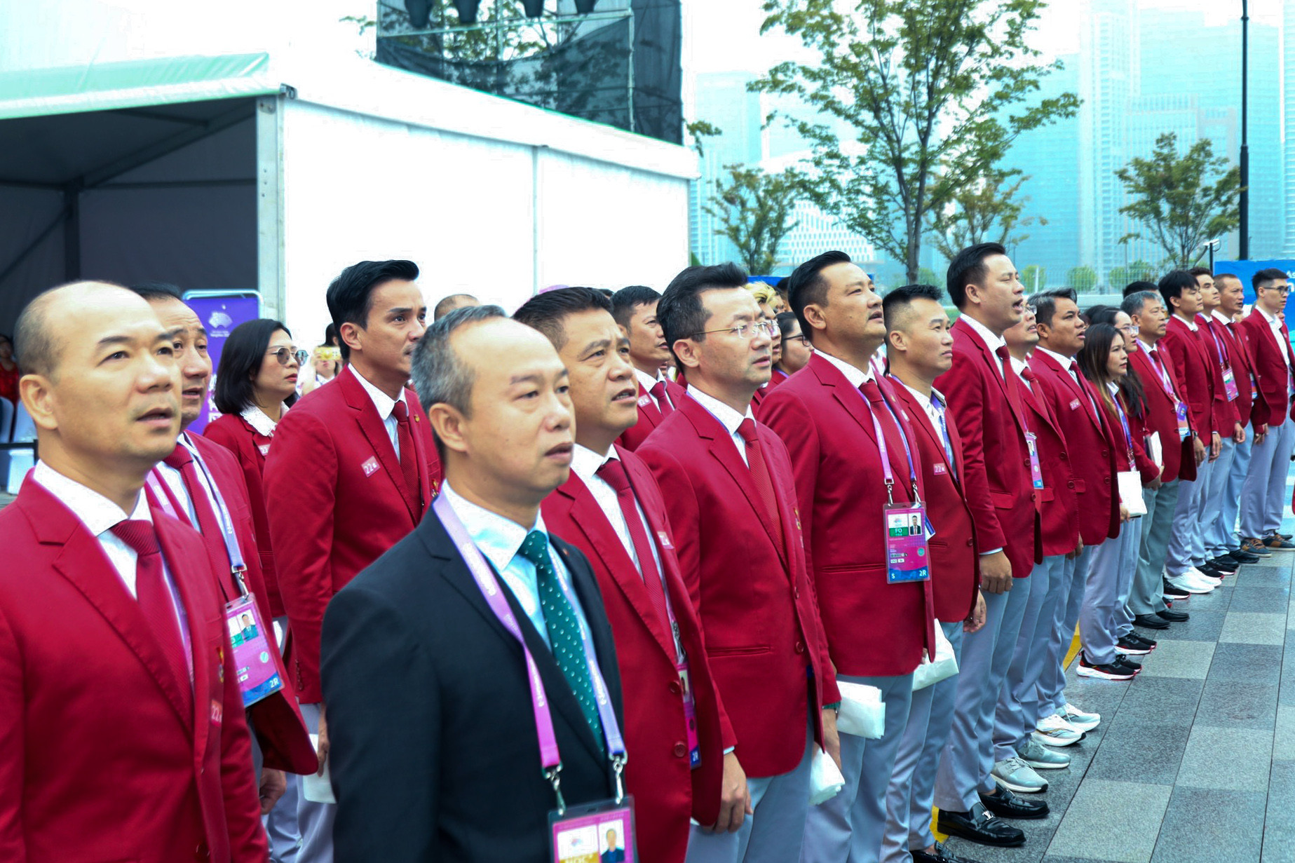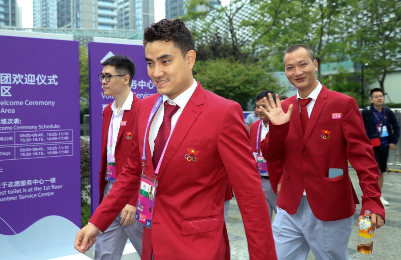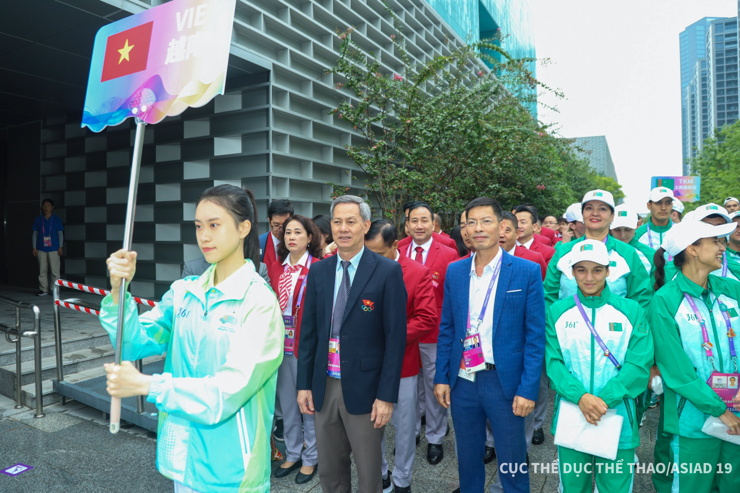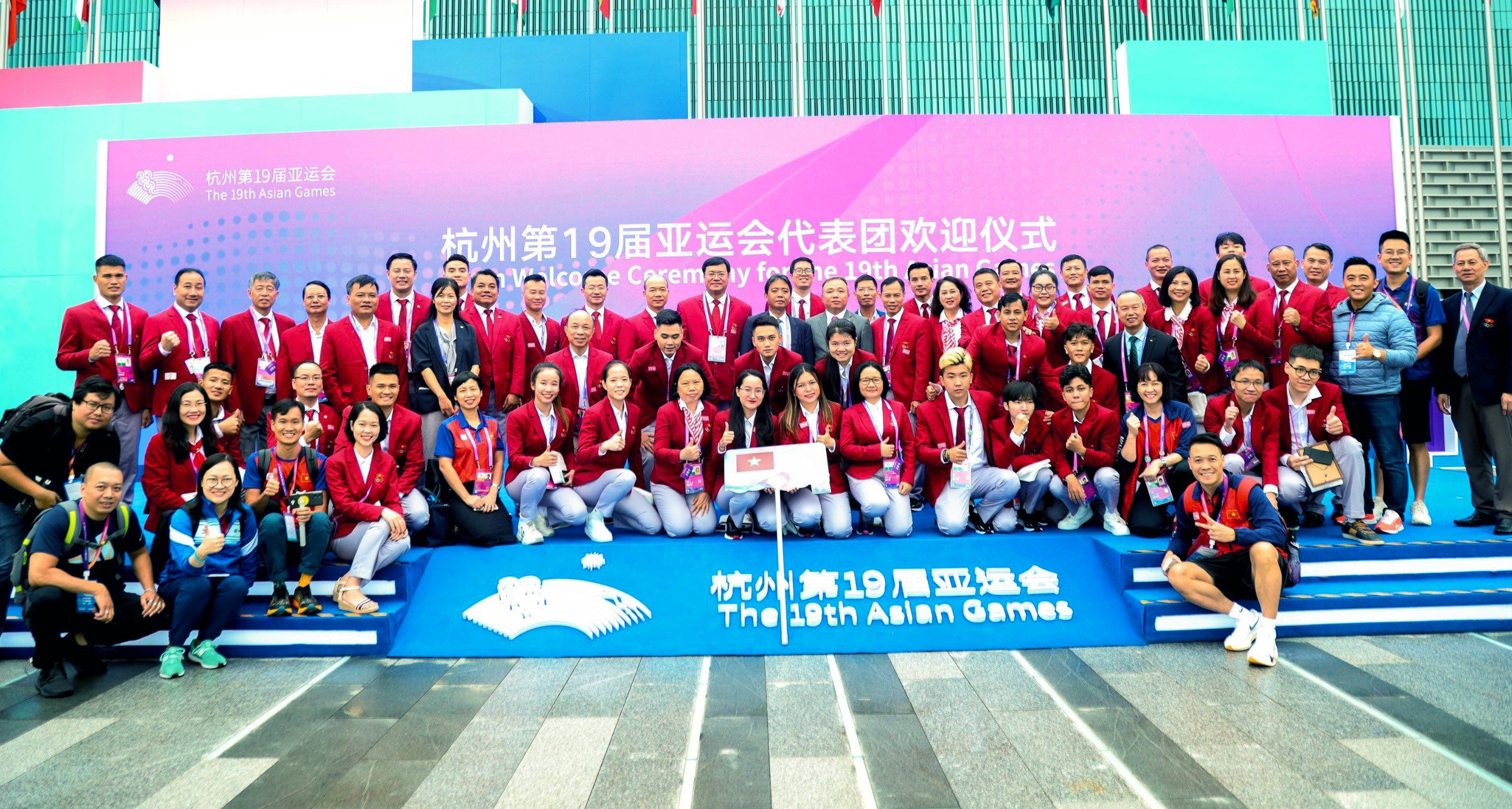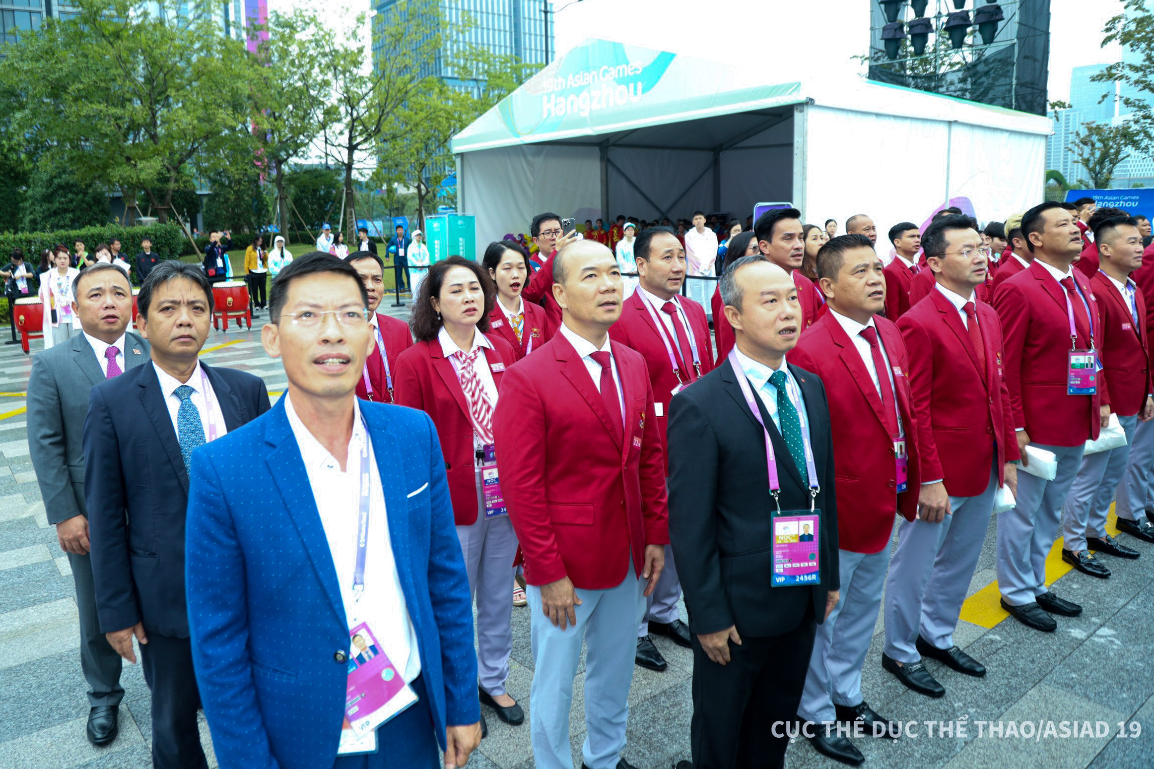 Trước ngày khai mạc Asiad 19, các thành viên đoàn thể thao Việt Nam tham dự lễ thượng cờ tại quảng trường Làng VĐV Á vận hội 19, tại Hàng Châu, Trung Quốc. Kiếm thủ Vũ Thành An là một trong những gương mặt quen thuộc của thể thao Việt Nam.Lễ thượng cờ là nghi lễ quan trọng đánh dấu sự có mặt của các đoàn thể thao tại Asiad 19. Cùng cử hành nghi lễ thượng cờ trong sáng 22/9 còn có các quốc gia và vùng lãnh thổ như Ma Cao (Trung Quốc), Malaysia, Saudi Arabia, Timor Leste, Turmekistan. Lá cờ đỏ sao vàng của Việt Nam tung bay tại quảng trường Làng VĐV Asiad 19, đánh dấu sự có mặt chính thức của đoàn Thể thao Việt Nam tại Đại hội. Đoàn thể thao Việt Nam dự Asiad 19 với 504 thành viên trong đó có 337 VĐV, đặt mục tiêu giành 2-5 HCV ở các môn: cầu mây, xe đạp, cử tạ, karate, bắn súng, bắn cung, cờ tướng.Tại Lễ thượng cờ, đại diện cho BTC gửi lời chào mừng trân trọng tới các đoàn tham dự Đại hội và tặng quà lưu niệm cho các đoàn. "Thực lực cho thấy việc giành thành tích tại đại hội là rất khó khăn, ngoài những VĐV trọng điểm có khả năng đột phá thì những VĐV khác phải phấn đấu vượt qua chính mình. Đây cũng là sự quyết tâm giành thành tích và cũng là lời hứa của đoàn thể thao Việt Nam trước lúc lên đường làm nhiệm vụ", trưởng đoàn Đặng Hà Việt nói.Asiad 19 diễn ra tại Hàng Châu, Trung Quốc. Lễ khai mạc Asiad vào ngày 23/9, bế mạc ngày 8/10. Hai VĐV cầm cờ cho đoàn thể thao Việt Nam ở lễ khai mạc Asiad là Nguyễn Huy Hoàng (bơi) và Nguyễn Thị Hường (bắn súng).