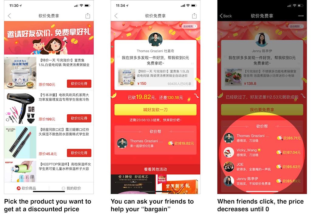 Pinduoduo cũng hấp dẫn người dùng thông qua các tính năng quen thuộc trong game. Chẳng hạn, có một mục cung cấp mặt hàng độc quyền cho người dùng mới như son giá 1 nhân dân tệ, đồ nướng giá 49,9 nhân dân tệ. Trong mục khác có tên “Giảm giá và mua miễn phí”, người dùng được xem danh sách các sản phẩm như robot thông minh giá 72 nhân dân tệ. Bấm vào đây, họ sẽ thấy giá giảm còn 9,34 nhân dân tệ. Chia sẻ càng nhiều, giá càng giảm. Mục tiêu là để nhiều người dùng nhất có thể bấm vào mặt hàng để giảm giá còn 0 đồng dù rất khó thực hiện vì càng về sau, mức giảm giá tương ứng mỗi lần bấm vào càng nhỏ.