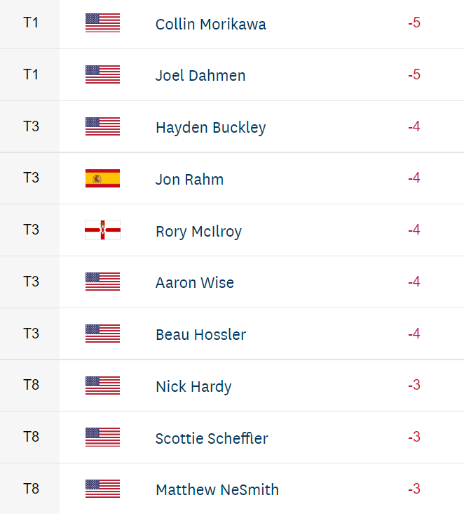 Có 5 golfer cùng đạt tổng điểm -4 sau vòng hai là Hayden Buckley, Beau Hossler, Rory McIlroy, Jon Rahm và Aaron Wise.