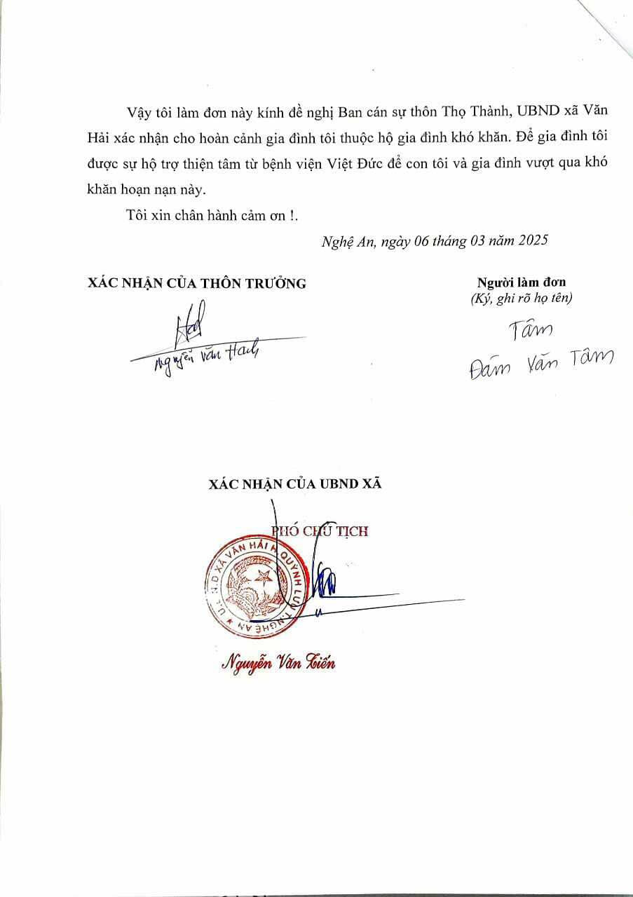 Mọi sự giúp đỡ xin gửi về: 1. Gửi trực tiếp: Bà Ngô Thị Hạnh, thôn Thọ Thành, xã Quỳnh Thọ, huyện Quỳnh Lưu, tỉnh Nghệ An. SĐT: 0329742165 2. Ủng hộ qua Báo VietNamNet: Ghi rõ ủng hộ MS 2025.062 (anh Đàm Văn Tư) Chuyển khoản: Báo VIETNAMNET Số tài khoản: 0011002643148. Sở giao dịch Ngân hàng Ngoại Thương Việt Nam - 198 Trần Quang Khải, Hà Nội - Chuyển khoản từ nước ngoài: Bank account: Báo VIETNAMNET - The currency of bank account: 0011002643148 - Bank:- BANK FOR FOREIGN TRADE OF VIETNAM - Address: 198 Tran Quang Khai, Hanoi,Vietnam - SWIFT code: BFTVVNV X - Qua TK ngân hàng Vietinbank: Chuyển khoản: Báo VietNamNet Số tài khoản: 114000161718 Ngân hàng TMCP Công Thương Việt Nam - Chi nhánh Đống Đa - Chuyển tiền từ nước ngoài: Vietnam Joint Stock Commercial Bank for Industry and Trade, Dong Da Branch - Address: 183 Nguyễn Lương Bằng, quận Đống Đa, Hà Nội - Swift code: ICBVVNVX126 3. Hoặc trực tiếp báo VietNamNet: - Phía Bắc: Địa chỉ: Tầng 18, Tòa nhà Cục Viễn thông (VNTA), số 68 đường Dương Đình Nghệ, phường Yên Hòa, quận Cầu Giấy, TP. Hà Nội. - Phía Nam: Văn phòng đại diện báo VietNamNet phía Nam, số 27 Nguyễn Bỉnh Khiêm, Quận 1, TP.HCM. Điện thoại: 19001081 |
