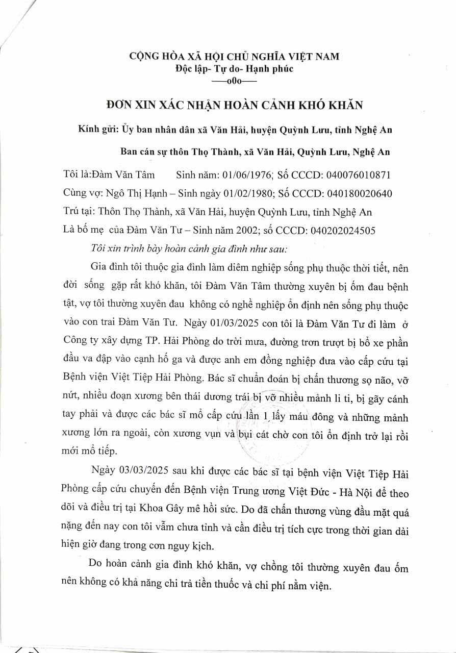 Phòng CTXH Bệnh viện Việt Đức xác nhận, bệnh nhân Đàm Văn Tư (23 tuổi) bị tai nạn giao thông đa chấn thương. Hoàn cảnh gia đình khó khăn, bố mẹ làm muối thu nhập thấp. Hiện bệnh nhân vẫn đang điều trị hồi sức, chi phí thuốc men đắt đỏ. Rất mong hoàn cảnh của bệnh nhân nhận được sự quan tâm, hỗ trợ từ cộng đồng.