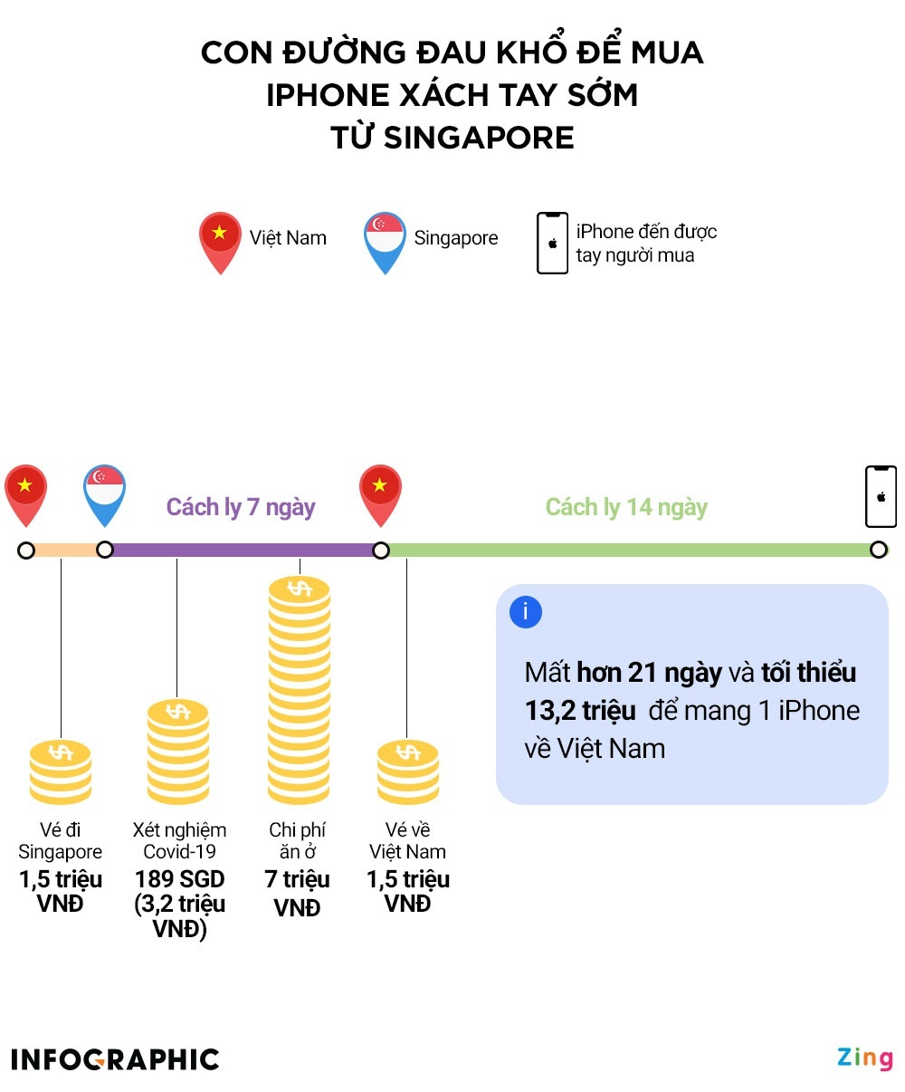 Nếu một người đến Singapore mua máy, họ sẽ mất đến 21 ngày và hơn 13 triệu đồng cho mỗi chiếc iPhone 12 về Việt Nam trong đợt đầu.