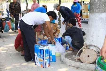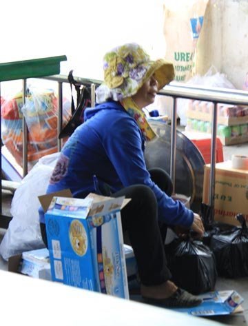 Người phụ nữ "đánh" hàng này đang lấy thùng sữa làm ghế ngồi |