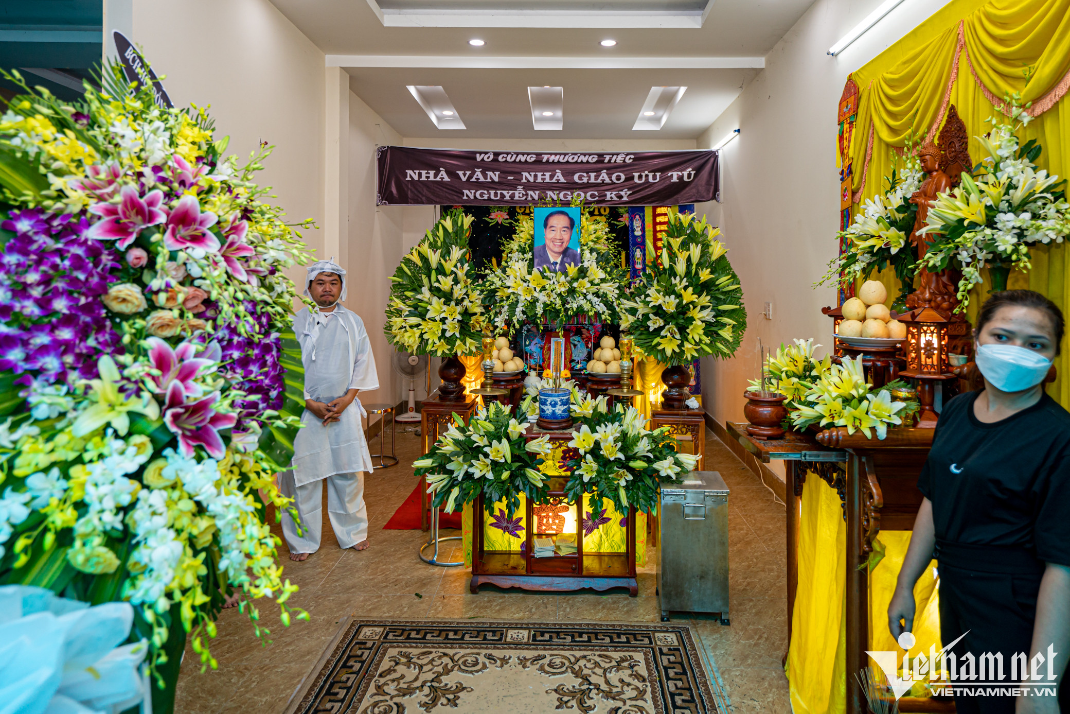 Nước mắt luôn trực trào trên đôi mắt bà Nguyễn Thị Thanh Hương. Người con gái thứ hai của thầy liên tục gào khóc mỗi khi có khách đến viếng và thăm hỏi. Bà cho biết, thầy Nguyễn Ngọc Ký phải chạy thận từ năm 2011 ba lần/tuần. "Cha là một người mẫu mực, luôn đồng hành với con cái dù vui buồn hay khó khăn. Ông không la mắng khi dạy con mà luôn đưa ra những câu chuyện để con hiểu được những điều sâu sắc", bà Hương kể lại.