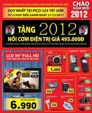 Điểm nhấn của chương trình là đêm 31/12, từ 21h30 đến 24h, không chỉ được thưởng thức các tiết mục ca nhạc tươi vui, ấn tượng, chào mừng một năm mới an lành và hạnh phúc, khách hàng còn được hòa mình trong một đêm mua sắm đầy sức hút, với “cơn mưa quà tặng” là 2012 chiếc nồi cơm điện - con số tượng trưng cho năm mới 2012, trị giá 495.000đ/cái, dành cho khách hàng đến mua sắm tại Pico 324 Tây Sơn có hóa đơn mua hàng từ 3.000.000 đồng trở lên.