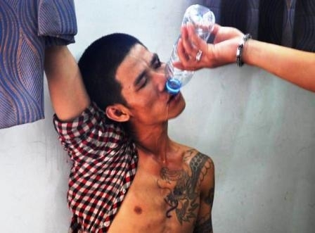 | Đối tượng Voòng Hùng Minh đang phê thuốc tại cơ quan công an. |