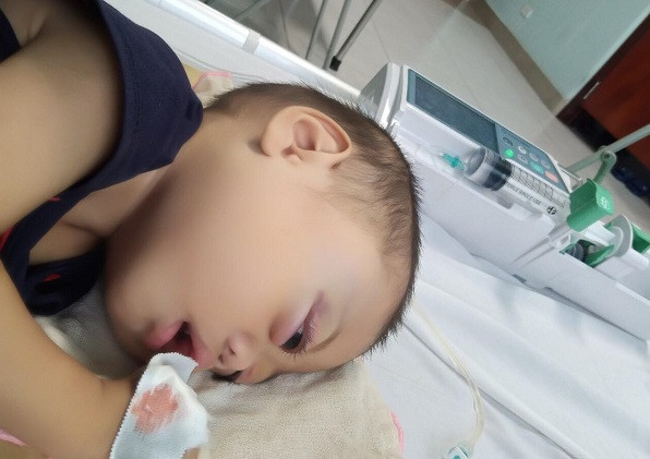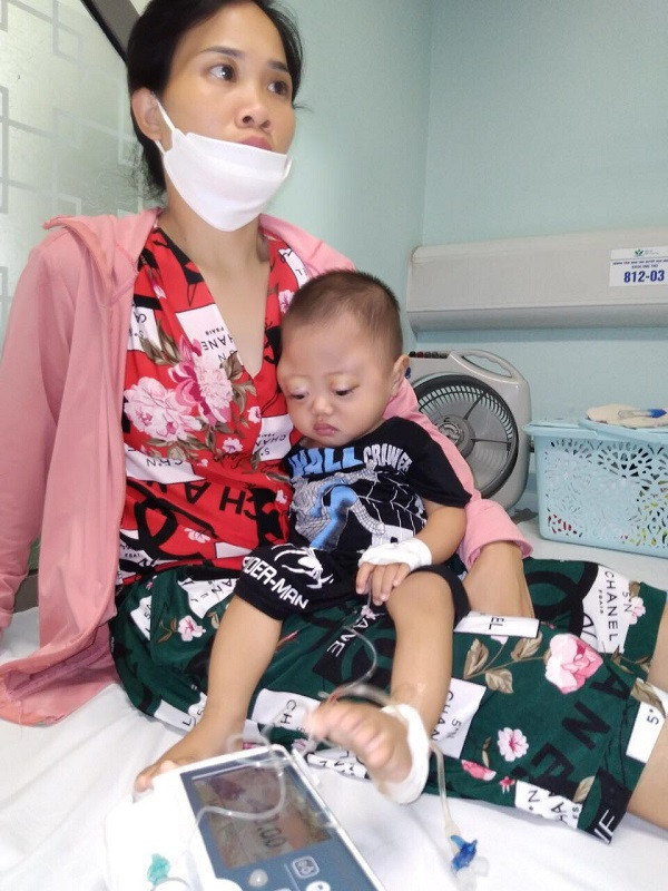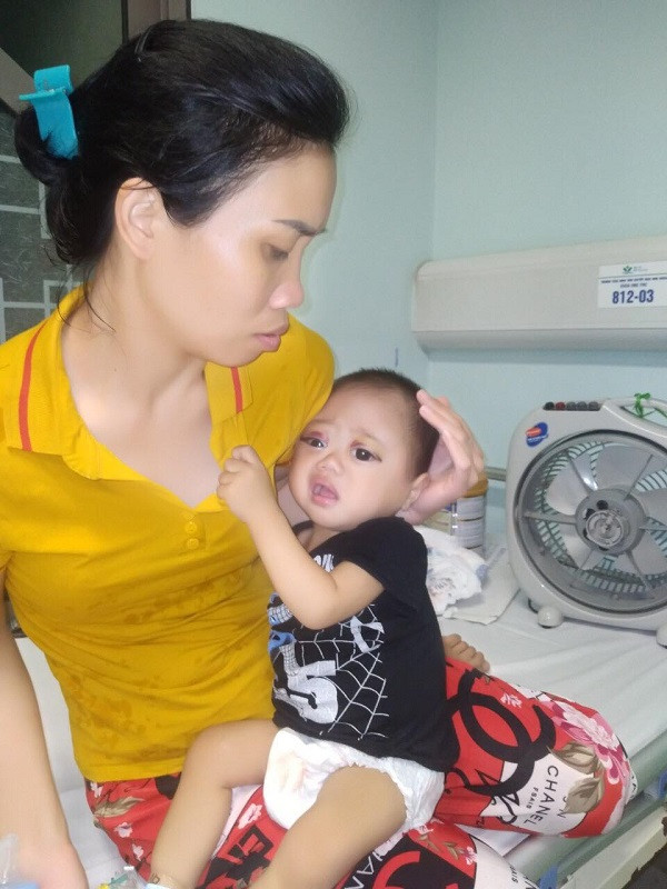 Biến chứng từ căn bệnh hiểm nghèo khiến đầu bé Hoàng Hải phình to bất thường, hai mắt lồi ra thâm tím. Con quá mệt mỏi, lại chưa biết nói nên chỉ có thể "hức, hức" những tiếng nhỏ đầy ấm ức. Ngồi xung quanh, nhiều thân bệnh nhân cùng phòng không khỏi xót xa.