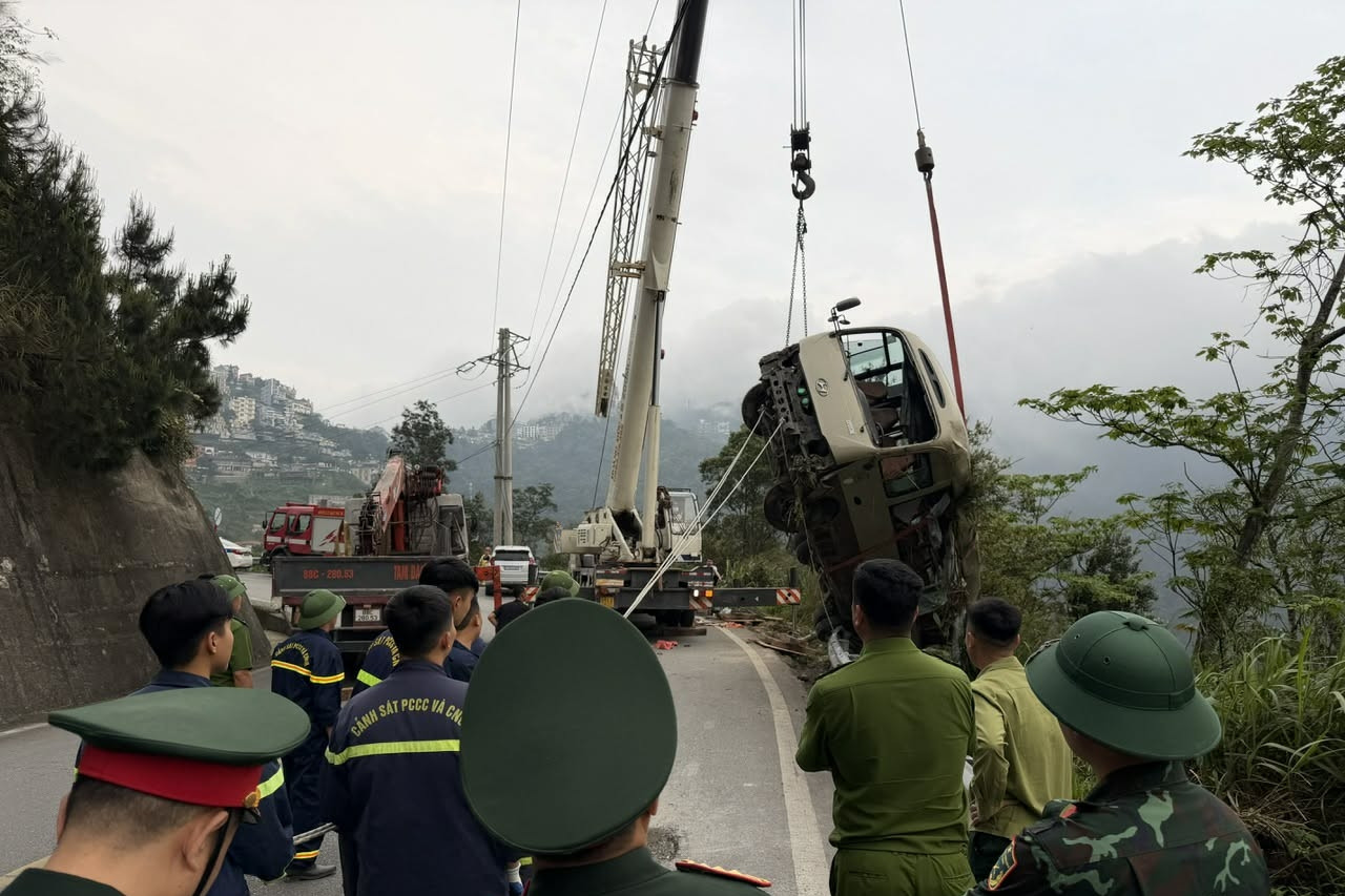 Tại hiện trường, xe khách bị lật, biến dạng, nằm dưới taluy dốc đứng. Thời tiết mưa ẩm khiến mặt đường trơn trượt, gây nhiều khó khăn cho công tác tiếp cận, cứu nạn.