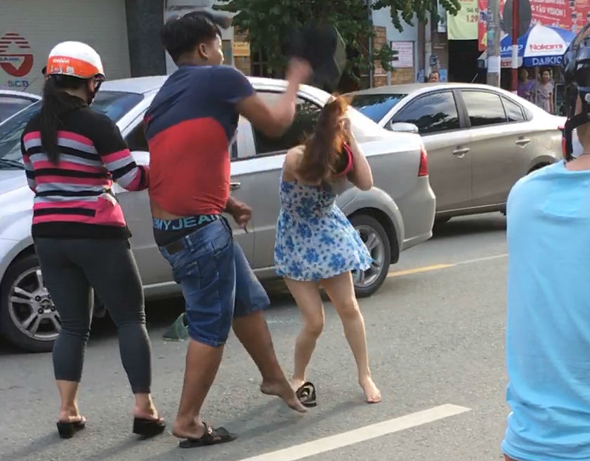 Dù được can ngăn nhưng anh này dùng mũ bảo hiểm đánh mạnh vào đầu cô gái vừa bước xuống xe ô tô. Có một người đàn ông ngồi ở ghế lái của ô tô nhưng người này không xuống và đang gọi điện thoại cho ai đó.