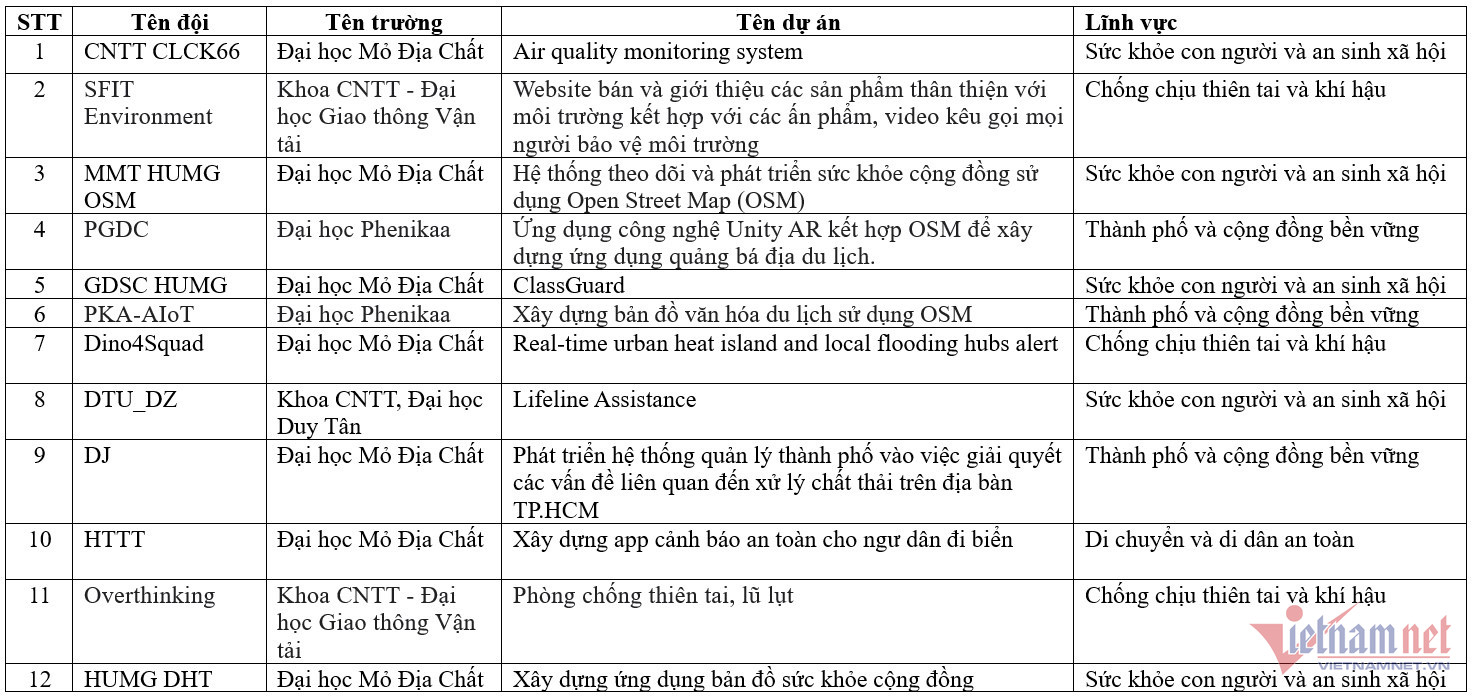 Đơn cử như: Dự án “Phát triển hệ thống quản lý thành phố vào việc giải quyết các vấn đề liên quan đến xử lý chất thải trên địa bàn TP.HCM” của nhóm DJ gồm 2 sinh viên Đại học Mỏ - Địa chất; dự án “Xây dựng app cảnh báo an toàn cho ngư dân đi biển” của nhóm HTTT cũng đến từ Đại học Mỏ - Địa chất; hay dự án “Website bán và giới thiệu các sản phẩm thân thiện với môi trường kết hợp với các ấn phẩm, video kêu gọi mọi người bảo vệ môi trường” của nhóm SFIT Environment đến từ khoa CNTT, Đại học Giao thông vận tải.
