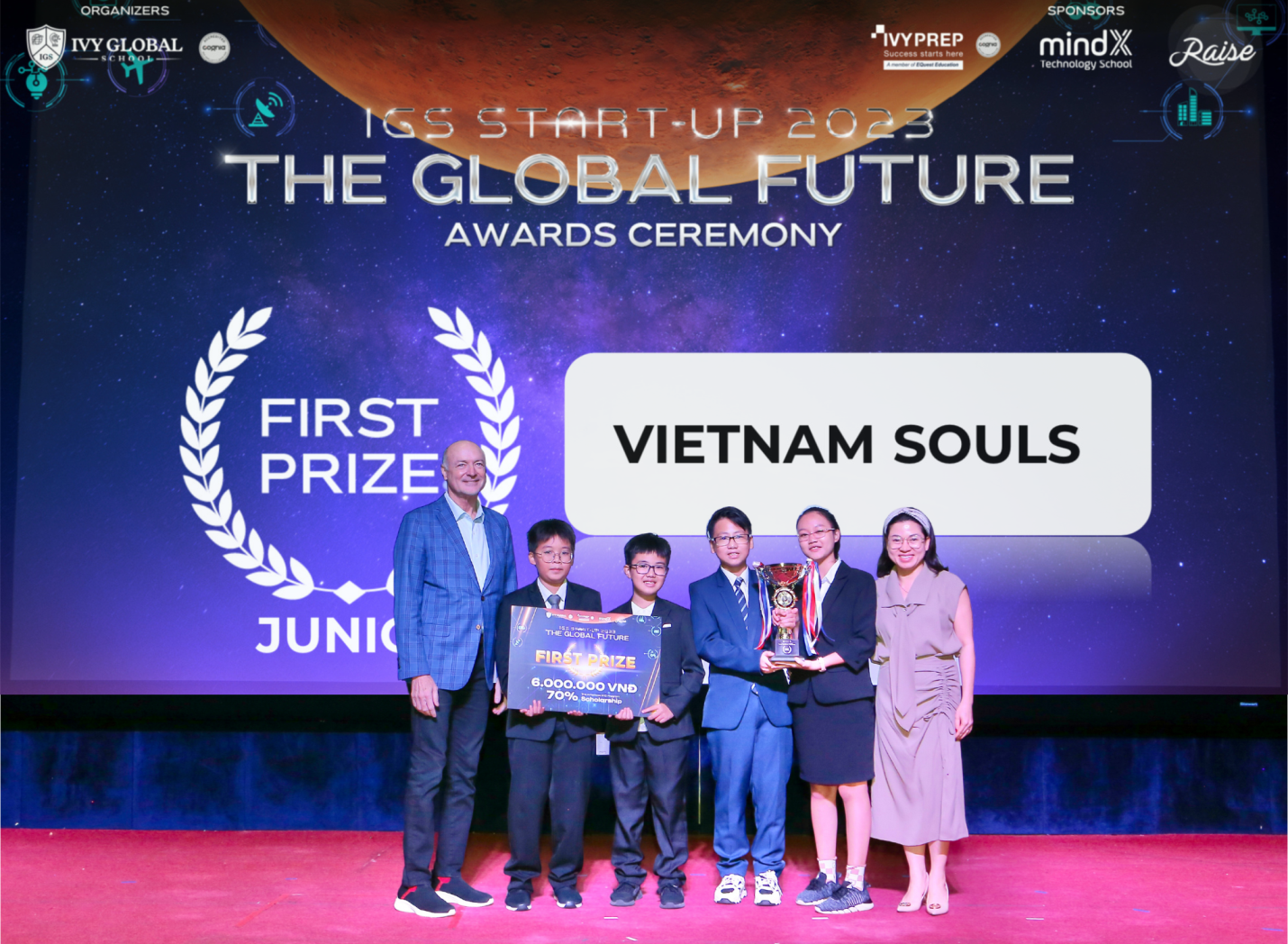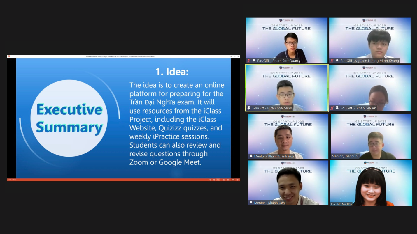 Được khởi động từ tháng 6/2023, IGS Start-Up 2023 thu hút hơn 600 thí sinh đăng ký tham gia và sau các vòng tuyển chọn, có 61 dự án lọt vào Vòng 1 được phân làm 2 bảng Junior (lớp 5-7) và Senior (lớp 8-10). Tiếp theo, có 31 dự án được 6 cố vấn chuyên môn lựa chọn để hướng dẫn hoàn thiện dự án. Kết quả, có 6 dự án được lựa chọn tham gia Vòng Chung kết: Vietnam Souls, Thavisc Bio-Charcoal, Jeducation (bảng Junior); Youture, Groove & Go, VRex (bảng Senior).