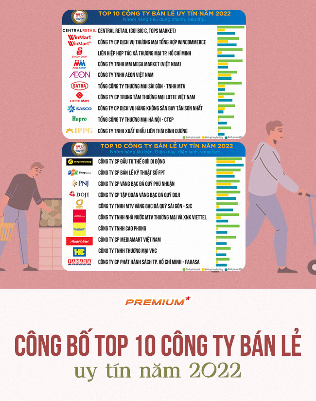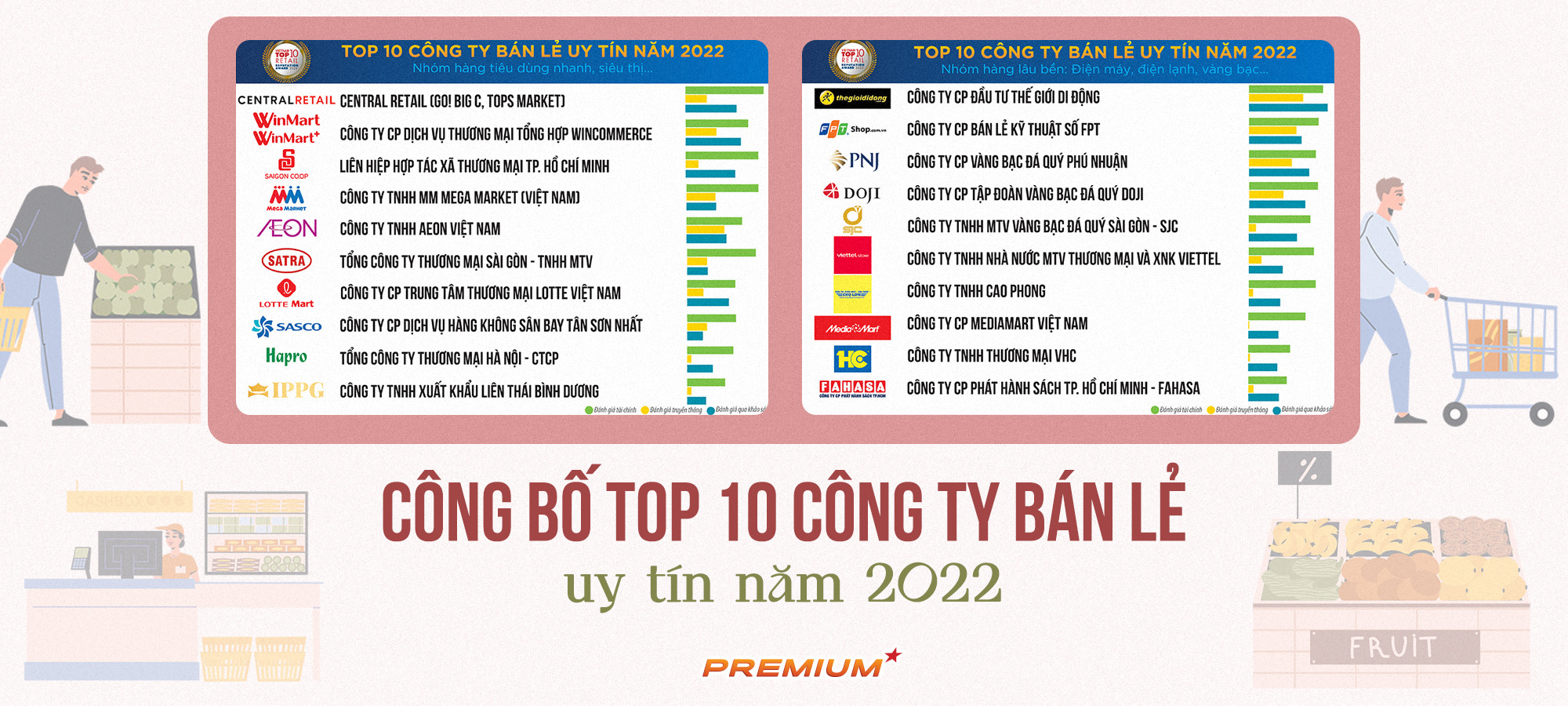 Top 10 Công ty Bán lẻ uy tín năm 2022 được xây dựng dựa trên nguyên tắc khoa học và khách quan. Các công ty được đánh giá, xếp hạng dựa trên 3 tiêu chí chính: (1) Năng lực tài chính thể hiện trên báo cáo tài chính năm gần nhất; (2) Uy tín truyền thông được đánh giá bằng phương pháp Media Coding - mã hóa các bài viết về công ty trên các kênh truyền thông có ảnh hưởng; (3) Khảo sát đối tượng nghiên cứu và các bên liên quan được thực hiện trong tháng 8 và 9/2022.