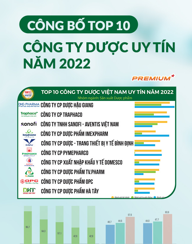 Top 10 Công ty Dược uy tín được xây dựng dựa trên nguyên tắc khoa học và khách quan. Các công ty được đánh giá, xếp hạng dựa trên 3 tiêu chí chính: (1) Năng lực tài chính thể hiện trên báo cáo tài chính năm gần nhất; (2) Uy tín truyền thông được đánh giá bằng phương pháp Media Coding - mã hóa các bài viết về công ty trên các kênh truyền thông có ảnh hưởng; (3) Khảo sát các đối tượng liên quan được thực hiện trong tháng 10-11/2022.