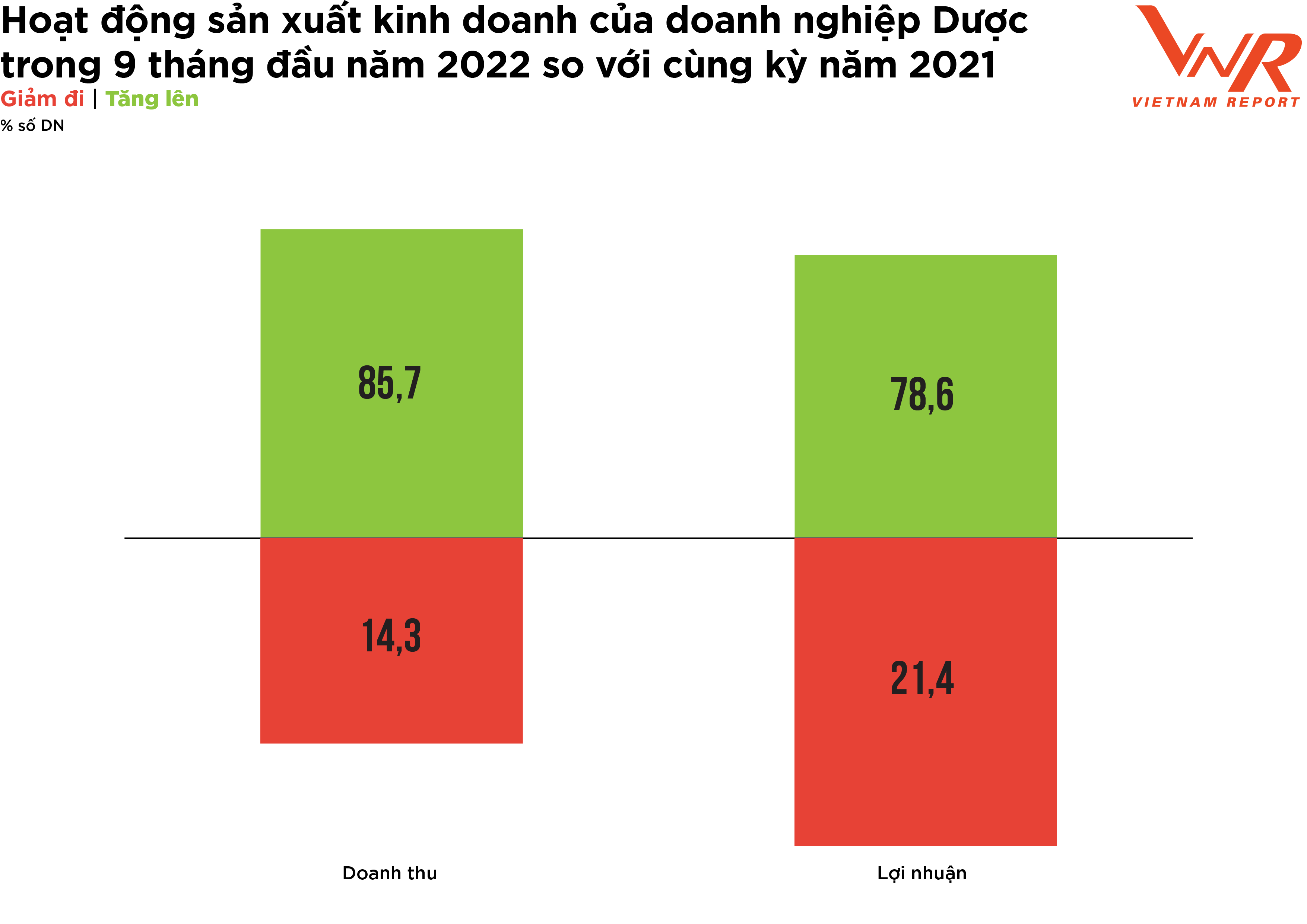 Theo khảo sát của Vietnam Report triển khai trong tháng 10-11/2022, gần 90% số doanh nghiệp sản xuất, phân phối và kinh doanh dược phẩm cho biết doanh thu tăng lên, gần 80% số doanh nghiệp ghi nhận mức tăng trưởng lợi nhuận trong 9 tháng đầu năm 2022 so với cùng kỳ năm 2021. Theo nhận định của phần lớn các chuyên gia, đại dịch COVID-19 đã tạo ra chuyển dịch nhanh hơn trong cơ cấu doanh thu ngành dược phẩm theo nhiều cách khác nhau. Một là, dịch bệnh bùng phát đã khiến người dân hạn chế đến khám chữa bệnh tại bệnh viện, đồng thời họ cũng chuyển sang mua thuốc điều trị triệu chứng COVID-19 và thực phẩm bổ sung hồi phục sức khỏe giai đoạn hậu COVID-19 tại kênh nhà thuốc. Hai là, sự gia tăng tiêu dùng đối với các sản phẩm vitamin hay thực phẩm chức năng để tăng cường hệ miễn dịch, củng cố sức khỏe trong bối cảnh "sống chung với COVID-19”. Ba là, nhà thuốc theo mô hình hiện đại giành được thị phần từ các hiệu thuốc truyền thống, khi Chính phủ dần đưa ra các quy định chặt chẽ hơn đối với các nhà bán lẻ dược phẩm (kiểm soát chặt chẽ hơn đối với thuốc kê đơn và triển khai hình thức đơn thuốc điện tử). Bốn là, kênh nhà thuốc có thể đã chiếm thị phần từ kênh bệnh viện, do các bệnh viện công thận trọng hơn trong hoạt động đấu thầu thuốc.