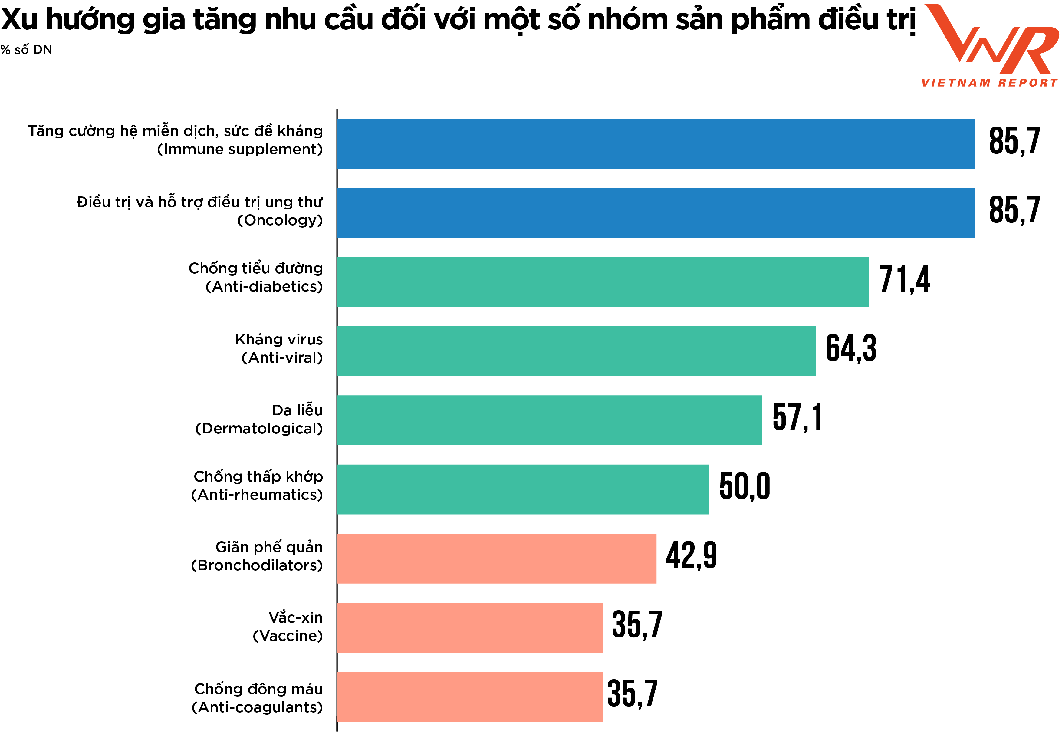Về lĩnh vực điều trị, khảo sát của Vietnam Report chỉ ra rằng, nhu cầu đối với hai nhóm sản phẩm tăng cường hệ miễn dịch, sức đề kháng và điều trị, hỗ trợ điều trị ung thư có xu hướng gia tăng lớn nhất trong tối thiểu một năm tới, đạt 85,7%. Trong khi đó, nhóm sản phẩm vắc-xin và chống đông máu có xu hướng gia tăng thấp hơn, đạt 35,7%. Điều này hoàn toàn phù hợp với xu hướng chung của thế giới.