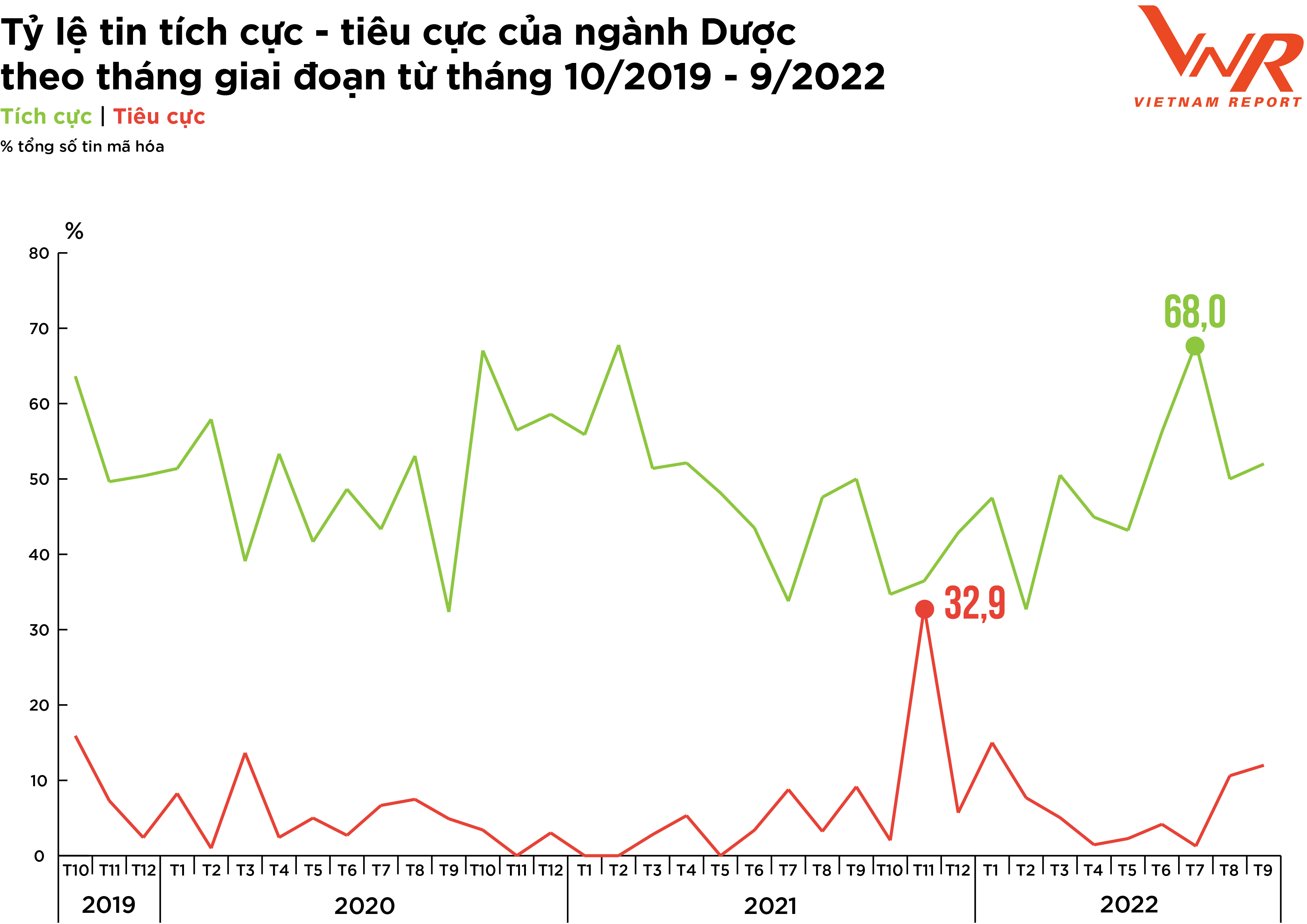 Xét về lượng tin tích cực và tiêu cực được tổng hợp từ tháng 10/2019 đến tháng 9/2022, kết quả cho thấy tháng 11/2021 lượng tin tiêu cực tăng cao đột biến, phản ánh sự quan tâm của dư luận đối với các vụ việc tiêu cực trong ngành y dược thời gian vừa qua và động thái mạnh tay chấn chỉnh, xử lý các sai phạm, vi phạm liên quan đến thuốc giả, thuốc kém chất lượng của cơ quan quản lý. Đây được cho là nguyên nhân dẫn đến sự tăng mạnh của tỷ lệ tin tiêu cực tại nhóm chủ đề Hình ảnh/ PR/ Scandals. Trong khi đó lượng tin tích cực có sự tăng cao trong tháng 7/2022 trái ngược lại với khoảng thời gian tháng 7/2021, với các tin tức liên quan đến hoạt động đầu tư, hợp tác, đẩy mạnh các chương trình đào tạo phát triển.