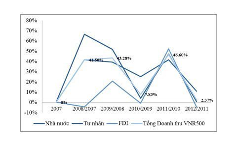 | Tỷ lệ tăng trưởng doanh thu của Bảng xếp hạng VNR500 từ năm 2007 đến 2012 |
