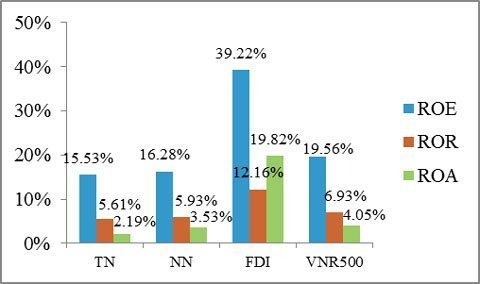 Soi kỹ hơn về số liệu từ BXH VNR500 năm 2012, rõ ràng, các doanh nghiệp VNR500 hoạt động khá hiệu quả trong năm 2011, mặc dù tình hình kinh tế không mấy khả quan. Tỷ suất sinh lời trên vốn chủ sở hữu- ROE của các doanh nghiệp VNR500 trung bình đạt 20%, đồng nghĩa với việc cứ 10 đồng vốn bỏ ra, doanh nghiệp thu về được 2 đồng lãi. Trong số đó, đáng lưu ý là nhóm DN FDI với tỷ suất ROE cao hơn hẳn so với nhóm DNNN và DNTN.