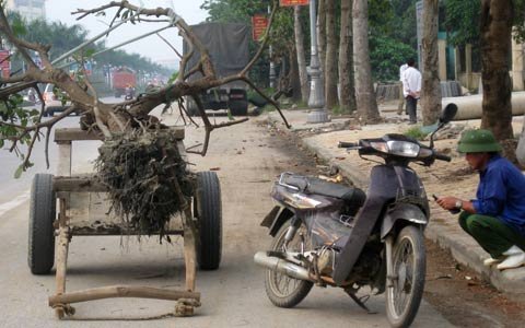Rất nhiều chiếc xe thô sơ chở cây sanh, cây lộc vừng lấn chiếm lòng lề đường bán cây cảnh với giá hàng chục triệu đồng.