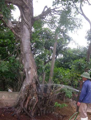 Ông P. đang phun nước tưới cho cây sanh mới được mua về từ huyện Quế Phong (Nghệ An) thông tin: “Tui chỉ là người làm thuê chăm sóc cây, nghe nói cây này mua từ Quế Phong về đến đây là gần 400 triệu. Giờ chăm để bán, nhưng cái đời cây cảnh cổ thụ thế này thì giá cả là vô cùng lắm”.