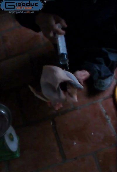 Anh ta cầm chiếc xi lanh rất to có lẽ chỉ dùng để “tiêm trâu”, đi ra sân giếng khoan thọc đầu kim tiêm xuống chậu nước lã vừa lấy ra từ trên bể nước, hút đầy một xi lanh nước rồi cầm con gà trên tay cực thuần thục. Chẳng để chúng tôi phải đợi lâu, người đàn ông cắm đầu kim vào lườn con gà rồi bắt đầu bơm. Nguồn nước từ xi lanh cứ thế đi theo đầu mũi kim rồi vào lườn con gà.