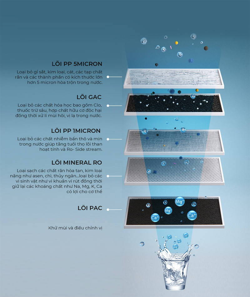 Cụ thể, máy lọc nước có ứng dụng công nghệ Mineral RO sẽ loại bỏ các tạp chất kích thước lớn, các chất ô nhiễm như kim loại nặng, hóa chất độc hại cho nguồn nước sạch tinh khiết, mà vẫn giữ lại các khoáng chất tự nhiên. Nguồn nước đầu ra sẽ giữ được khoáng chất tự nhiên sẵn có trong nước, thay vì bổ sung khoáng chất nhân tạo từ bên ngoài như nhiều dòng máy lọc nước bù khoáng hiện nay trên thị trường.