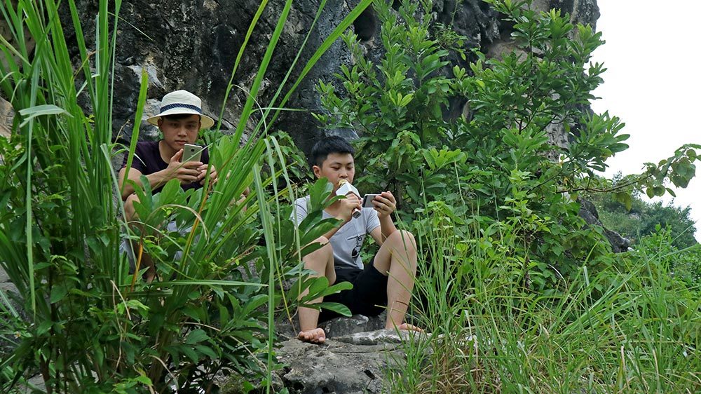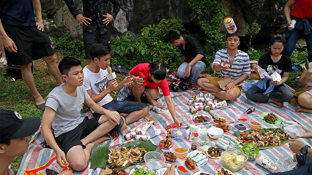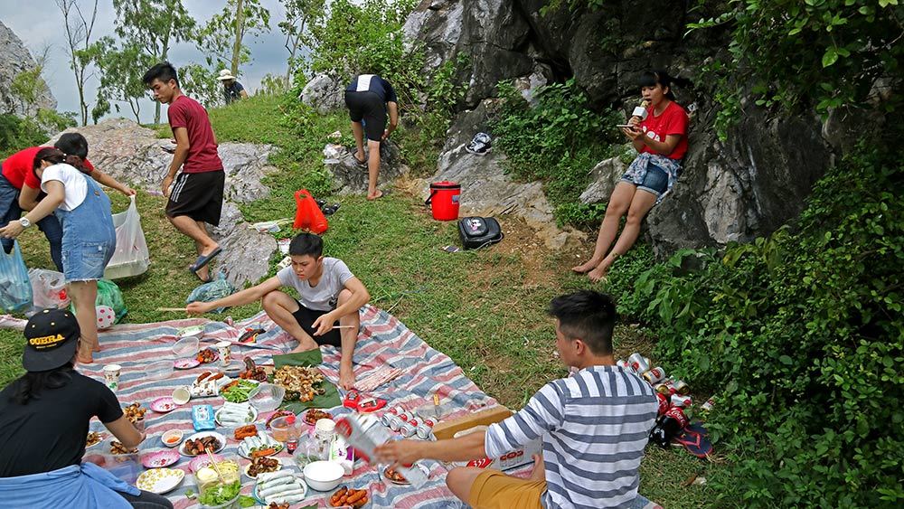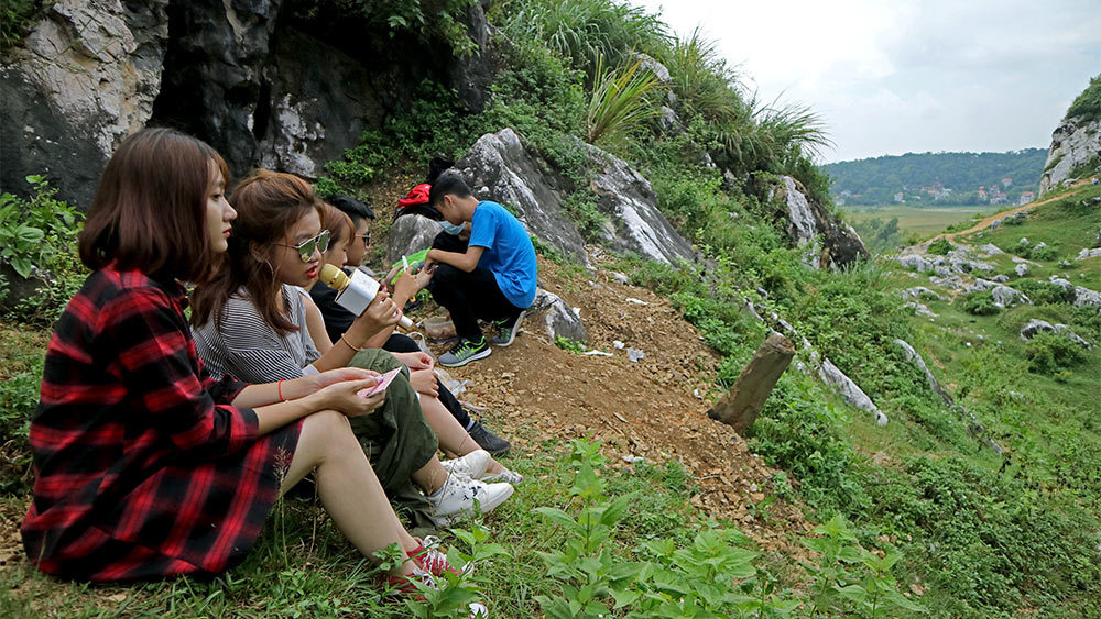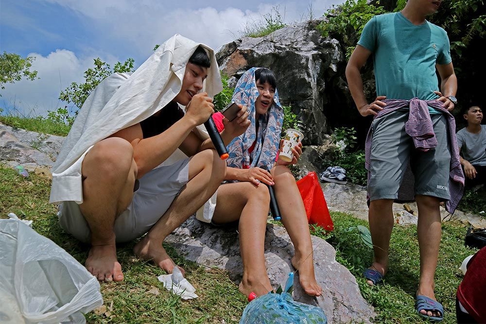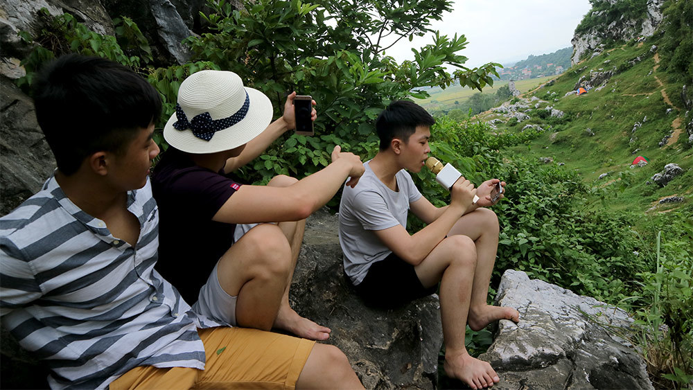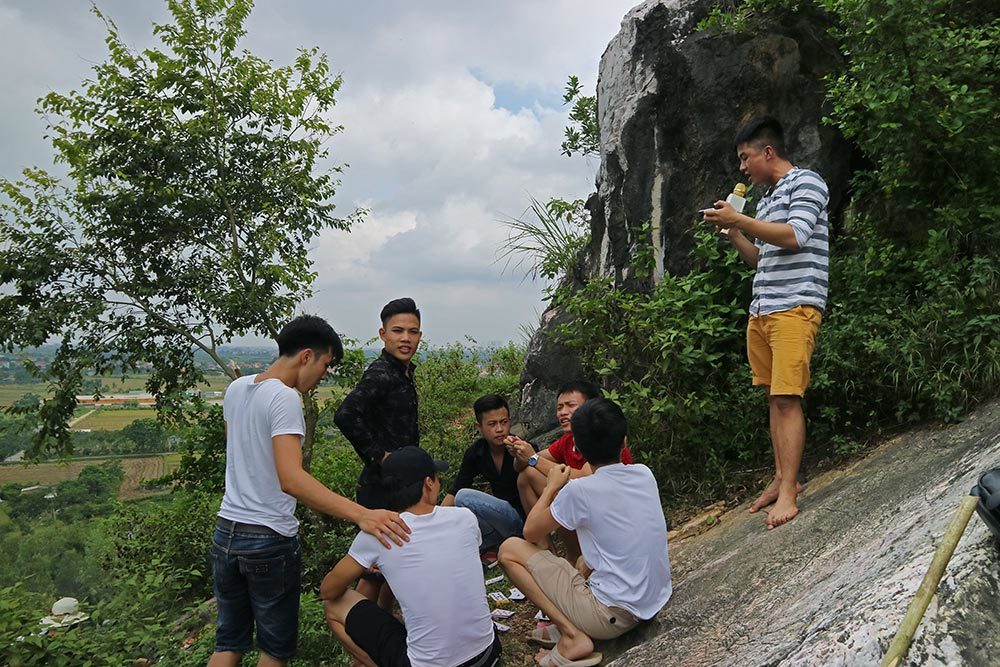 Nhóm nam nữ sinh viên đang theo học năm thứ nhất các trường Đại học Nội Vụ, Học viện Kỹ thuật Quân du lịch núi núi Trầm (Chương Mỹ - Hà Nội) không quên mang theo micro karaoke để thỏa niềm đam mê ca hát.