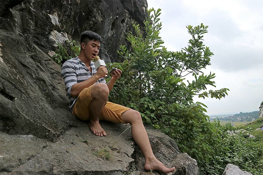 Không màng mấy trò chơi mà đám thanh niên thường đam mê, Dương Văn Hải (quê Nghệ An) say mê hát với chiếc micro đa dụng, mắt luôn dán vào màn hình chiếc smartphone quyết không sai lời hát.