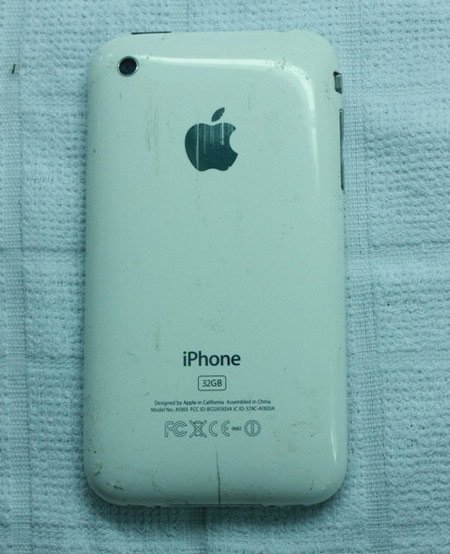 Một chiếc iPhone 3G màu trắng cũ, vỏ nứt.