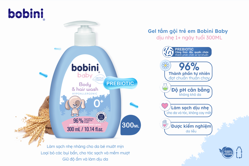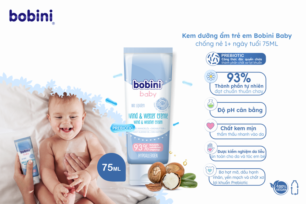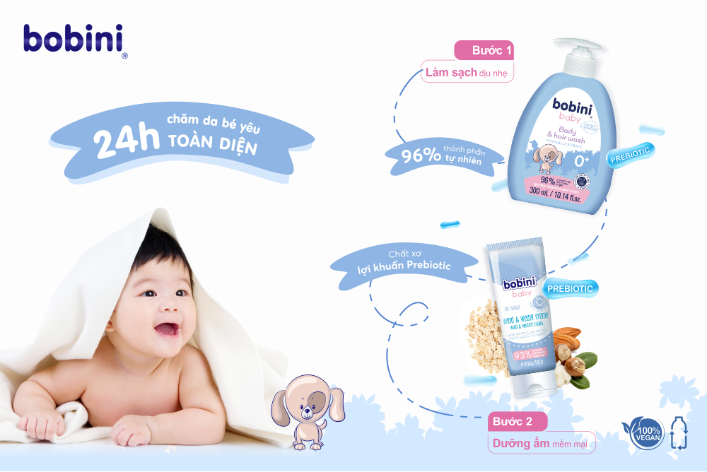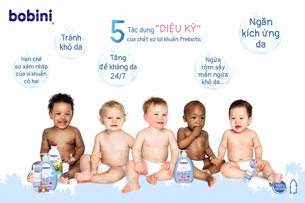 Bobini đã nghiên cứu và ứng dụng ngay thành phần Prebiotic một cách hiệu quả nhất vào các sản phẩm chuyên biệt dành riêng cho trẻ sơ sinh như gel tắm gội, kem dưỡng ẩm, dầu gội, sữa tắm,.... Điều này giúp cho làn da trẻ được chăm sóc cẩn thận và khỏe mạnh hơn với cơ chế bảo vệ da “kép”: làm sạch và dưỡng ẩm. Prebiotic sẽ tác động trực tiếp trên da, góp phần hạn chế tình trạng rôm sảy, mẩn ngứa.