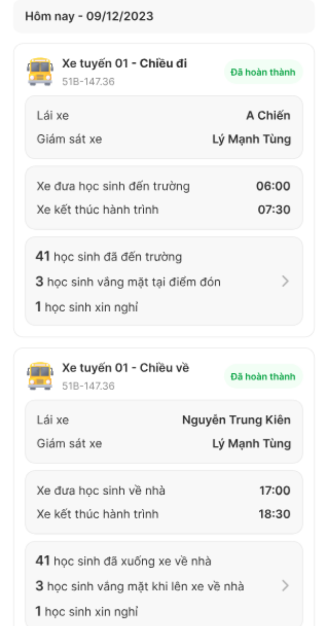 Khi lên xe, học sinh sẽ được điểm danh bởi cô giáo, quẹt thẻ trực tiếp hoặc thông qua thiết bị camera AI. Với tài xế hoặc người phụ trách xe, sau khi học sinh xuống hết sẽ phải di chuyển đến cuối xe, quét mã QR để xác nhận kết thúc hành trình.