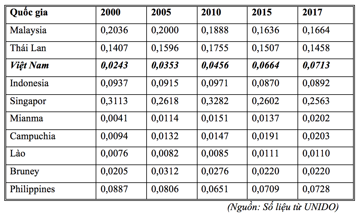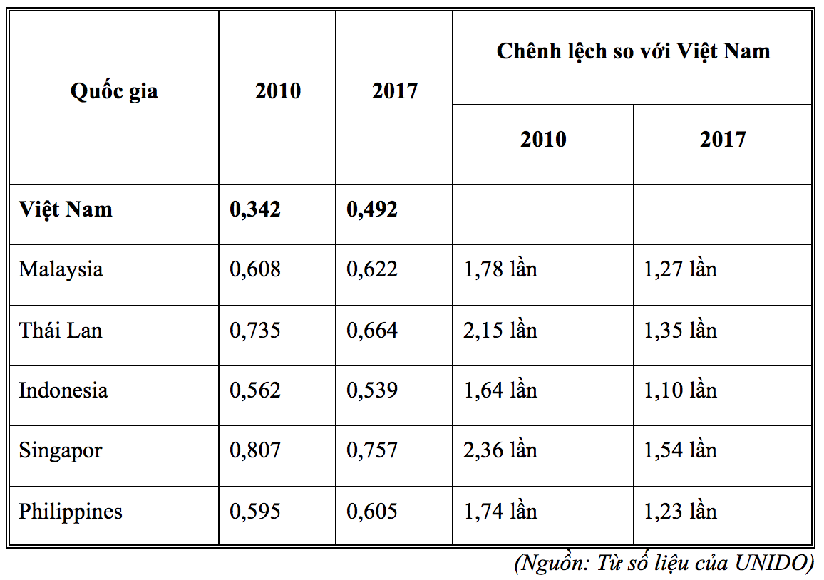 Trong khu vực Đông Nam Á, từ năm 2013 đến nay, nước ta tiếp tục duy trì đứng thứ 6/10 nước ASEAN. Đáng chú ý trong giai đoạn từ 2010 đến nay, do có tốc độ tăng cao hơn so với các nước trong ASEAN, nên chỉ số “Cường độ CNH” của nước ta đang được rút ngắn khoảng cách chênh lệch, so với 05 nước đứng đầu. Cụ thể, chỉ số của Indonesia hiện chỉ còn gấp 1,1 lần so với 1,64 lần của năm 2010; Philippines gấp 1,23 lần (so với 1,74 lần năm 2010); Malaysia gấp 1,27 lần (so với 1,78 lần năm 2010);…