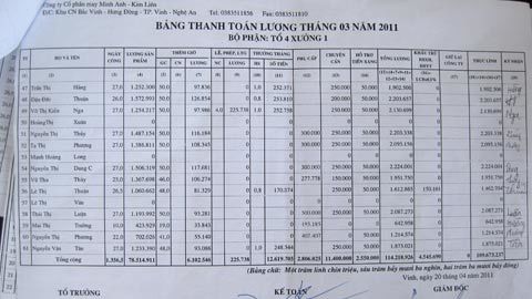 | Bảng lương tháng 3/2011 công nhân đã được nhận đầy đủ. |