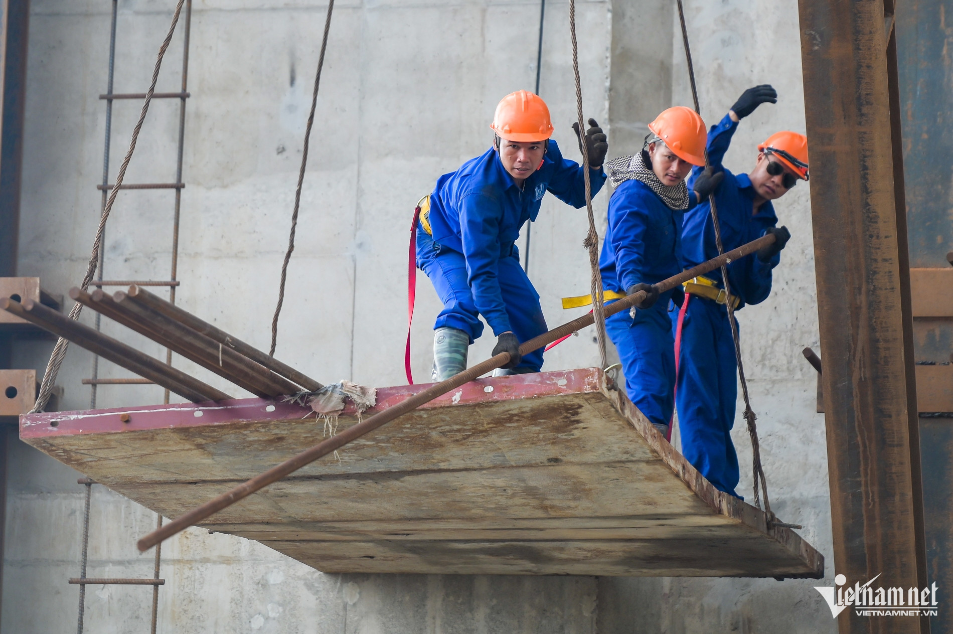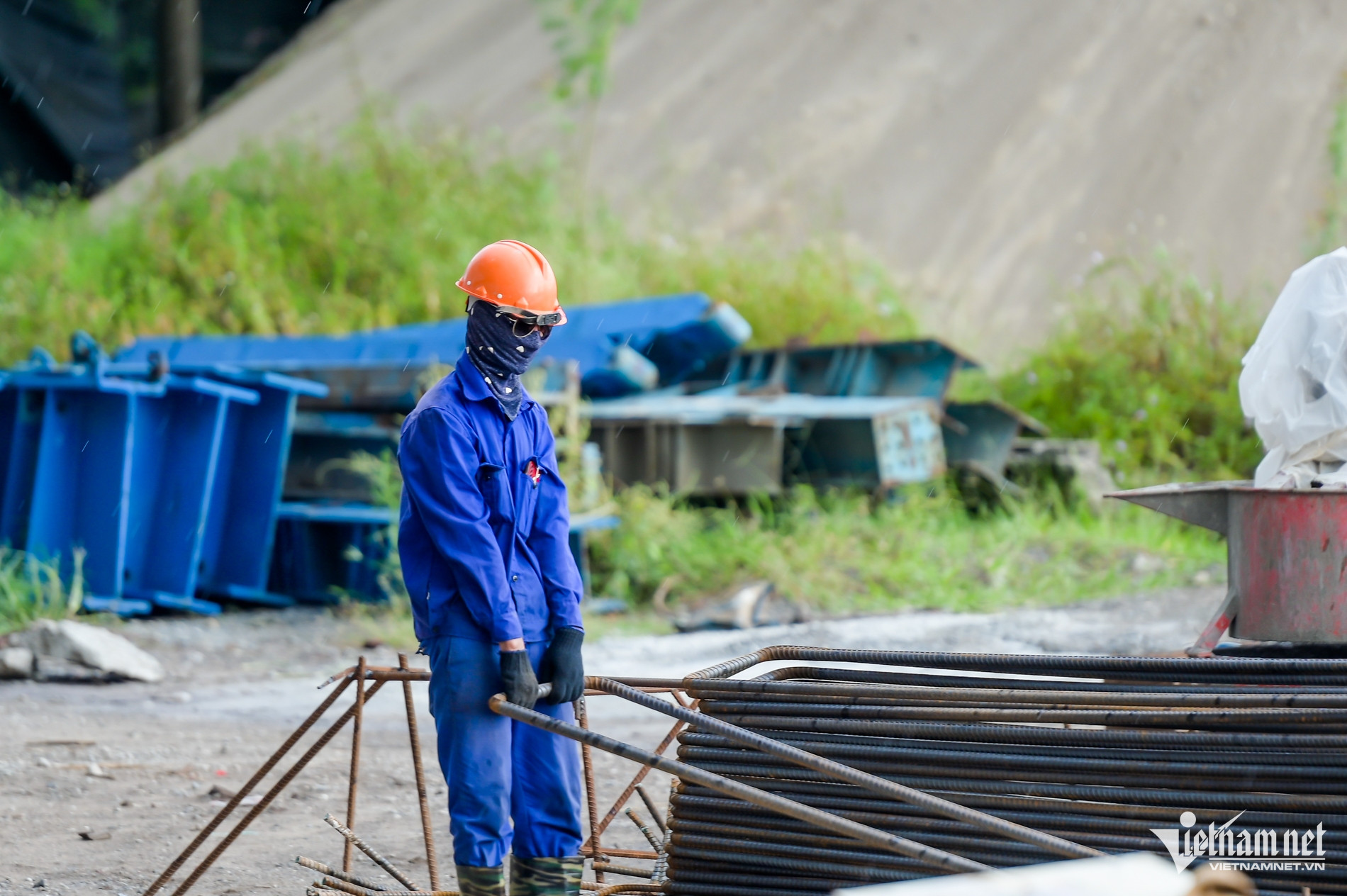 Công nhân "đội nắng, đội mưa" trên công trường để kịp tiến độ thi công dự án.
