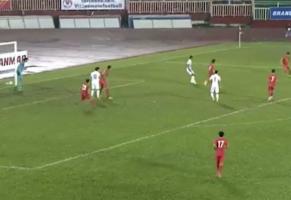 Từ quả đá phạt cố định chếch bên cánh phải, Quang Hải treo bóng vào góc cao khung thành U22 Hàn Quốc, nhưng bóng đi vọt xà ngang rất đáng tiếc.